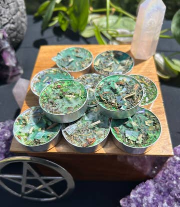 Prosperity and Wealth, to bring Abundance Tealight Spell Candles 10 pack Listing is for 10 Prosperity and Wealth Tealight Spell Candles Alpine Forest Scent. Each Spell Candle is labeled for individual sale. Each Tealight Spell Candle may vary slightly in appearance because each is hand dressed by me. Each Spell Candle is filled with herbs, flowers, handmade Anointing oils and all my intentions. Hold and focus on what you need, prosperity and wealth, a promotion, a better job etc. Imagine a bubble of energy surrounding you and protecting you from negative energies and outside influences. Intention and manifestation are everything. Spell candles can be used in rituals, spells, or just filled with your intentions and burned. *Please supervise all open flames! Never leave unattended!*