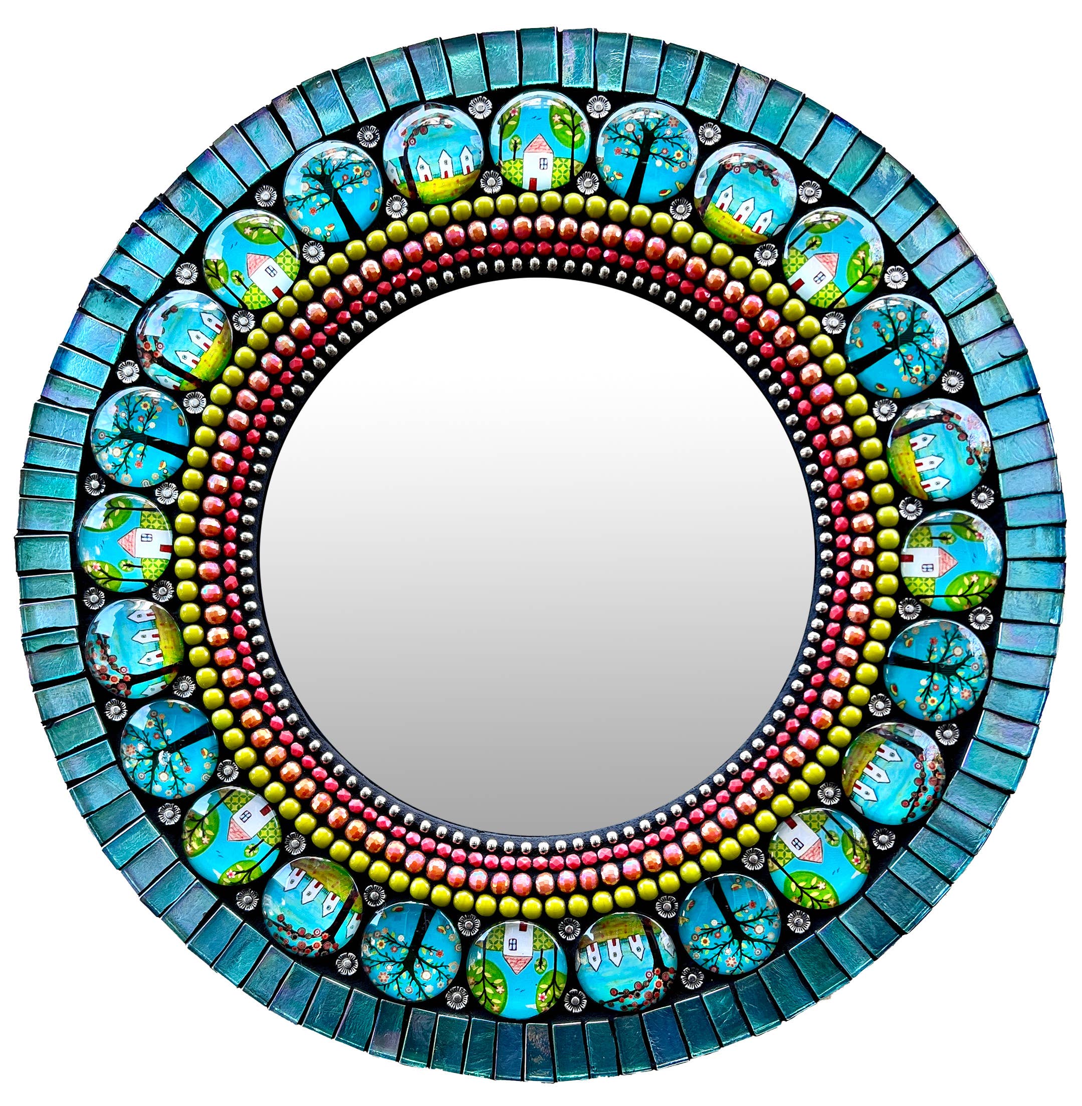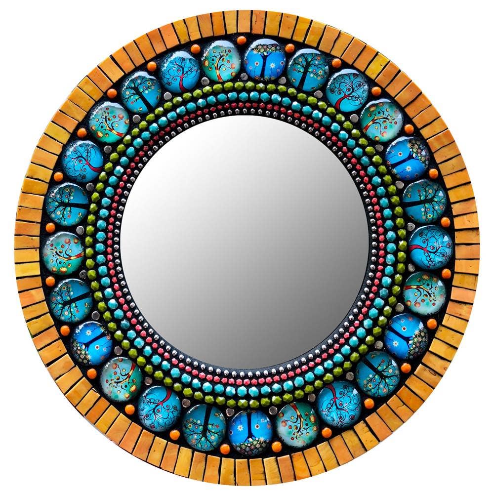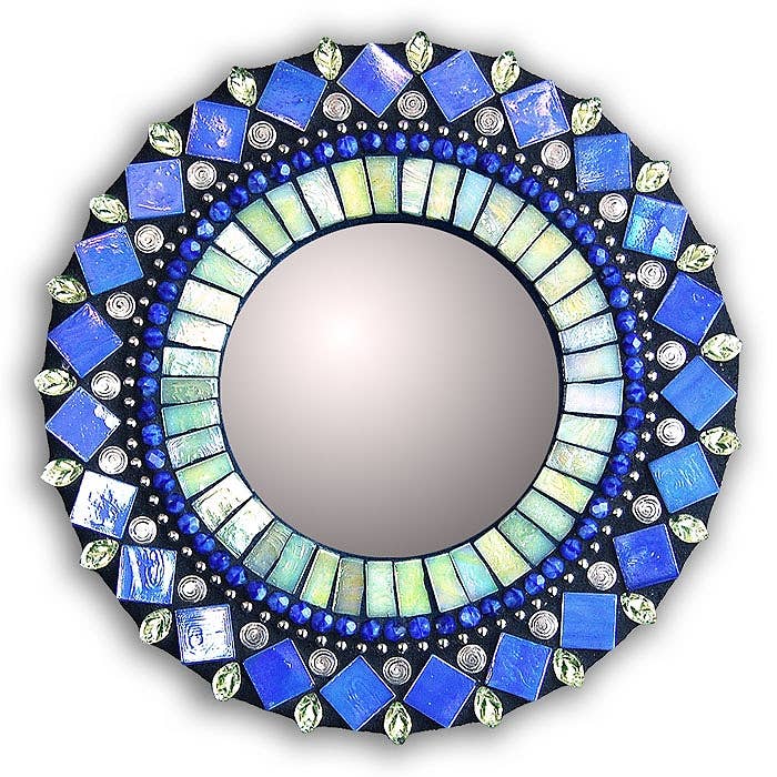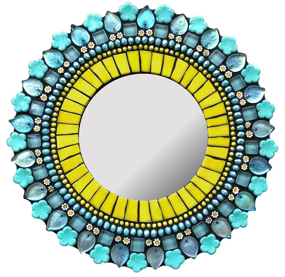 This glass mosaic mirror is from Zetamari's Sparkling Jewel mirror line, lovingly handmade to order and signed by the artist, Angie Heinrich. Intricately shaped glass tiles and beads come together to create a sparkling jewel of soothing symmetry to accent any room. Display this size mirror on a wall or on an easel. Dimensions include mirror and frame. Color: vibrant yellow and a light aqua come together to create a splash of sunshine and joy.