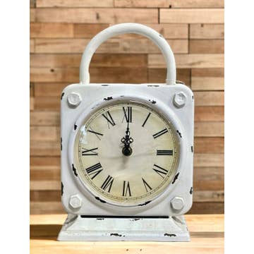 Keep track of time with this modern farmhouse style tabletop clock. The black galvanized metal structure features a glass cover over the clock face sealed with a black rim. The bold black and white color allow this clock to be styled with ease within your bookcase or on your tabletop, while still maintaining a timeless feel. -This tabletop clock adds a fun design piece to your shelf, mantel, or tabletop while still being functional. -Non-ticking mechanism. -AA Battery Not Included. -Clock face diameter: 4.5" -Materials: Metal & Plexiglass -Black washed galvanized metal finish offers a neutral and transitional display. -Complements a modern farmhouse decor style. -Perfect For: Farmhouse Home Decor, Home Decor Modern, Gift Shop Items, Home Decor Accents