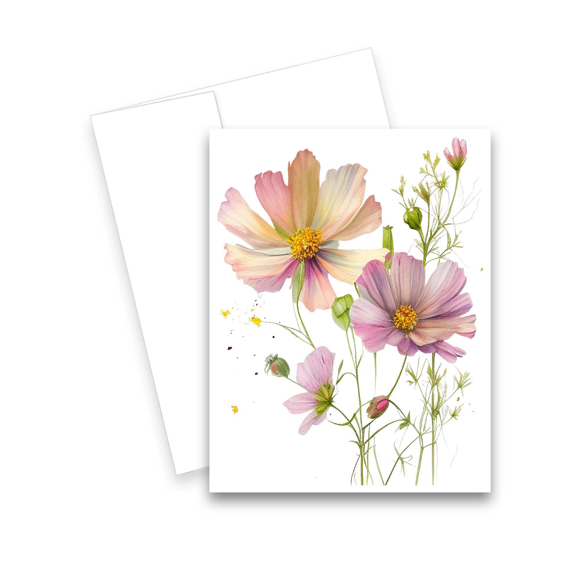 Includes 6 assorted greeting cards of florals from the farm. Printed on 110 lb watercolor texture paper. A2 Size: 4.25" x 5.5". Blank inside. White envelopes included. Cards come clear card box for set of 6 with a back that shows all the designs.