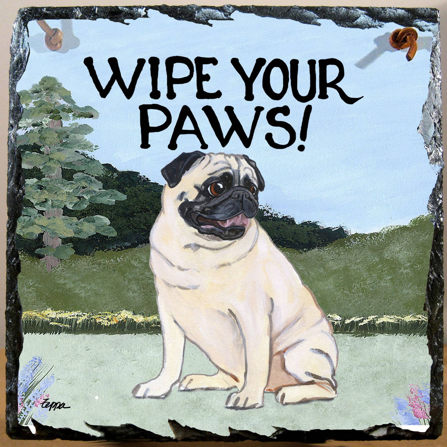 A pawfect greeting at your entry, in the kitchen or in your mud room! A hand hewn slate tiles measure about 7.5 x 7.5 inches and are a about 5/8 inches thick. They are drilled and fitted with a leather strap for easy hanging. Not for outdoor use.