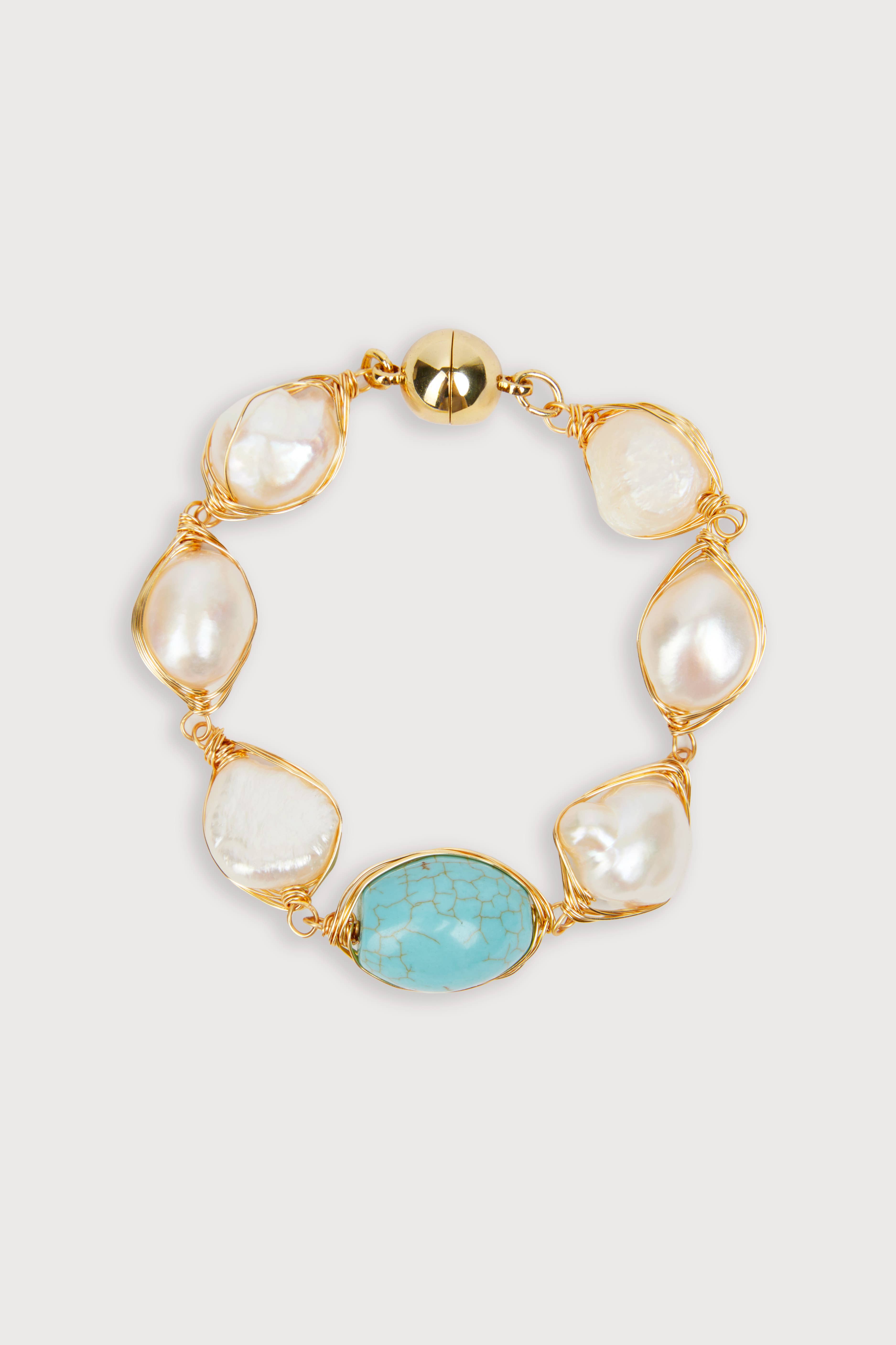 Handcast gold with labradorite crystal on genuine freshwater pearl bracelet.