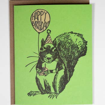 This letterpress-printed card features a hand-carved linoleum block print of an otter in brown ink. The hand-drawn imagery of a party hat and streamers are printed in turquoise with modern letterpress techniques. Blank inside. Comes with kraft envelope. A2 size.