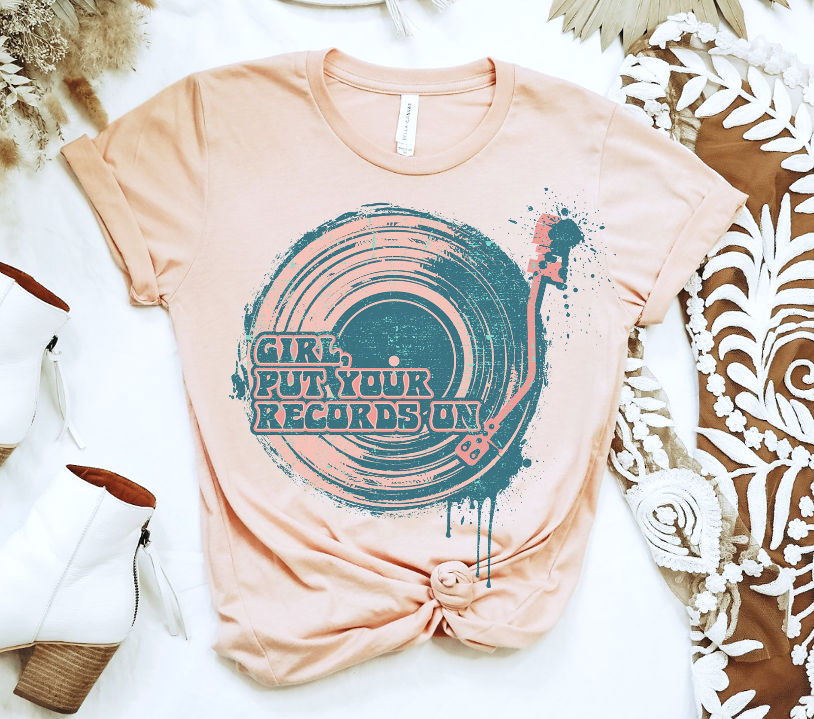 Set a whimsical tone with this sublimation shirt featuring the charming 'Put Your Record On' design. A playful nod to musical joy and carefree vibes, it's perfect for those who cherish the nostalgic sound of vinyl and the spirit of lightheartedness. Brands offered for each color: White, Sand, Cool Gray, Ice BLue , cream- Bella & Canvas Peach , Heather Gray Par-tees (tees made in Honduras that work excellent with our printing method. Fonts & colors will be as shown, but actual colors can vary slightly from monitor colors. Indulge in unmatched comfort and style with our Sublimation Soft Print Tees. Crafted with precision and care, these shirts boast a sublimation printing technique that guarantees a soft-to-the-touch feel, ensuring a luxurious and cozy experience. Our soft print designs can have a slightly heathered look due to the nature of direct-to-fabric printing on color shirts and designs may not be a solid color. Shirts are custom-made to order in-house!