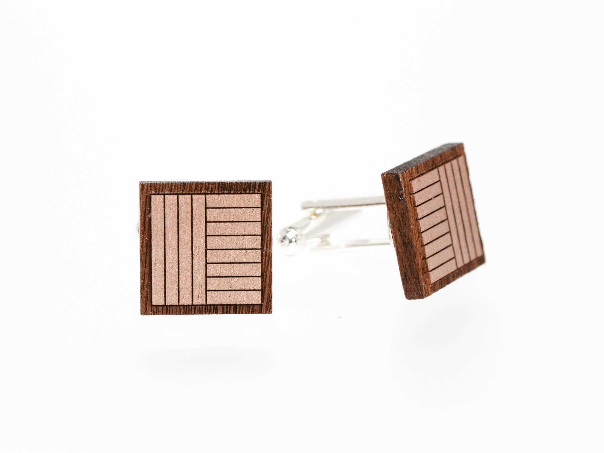 Intricately laser cut + etched tie bar made of solid, USA-sourced walnut wood. Perfectly sized to compliment a skinny tie. Measures 1 13/16"W by 3/8"T + finished on a hand forged nickel-silver slide clip. Shown on a 2.25" wide tie.