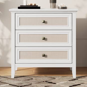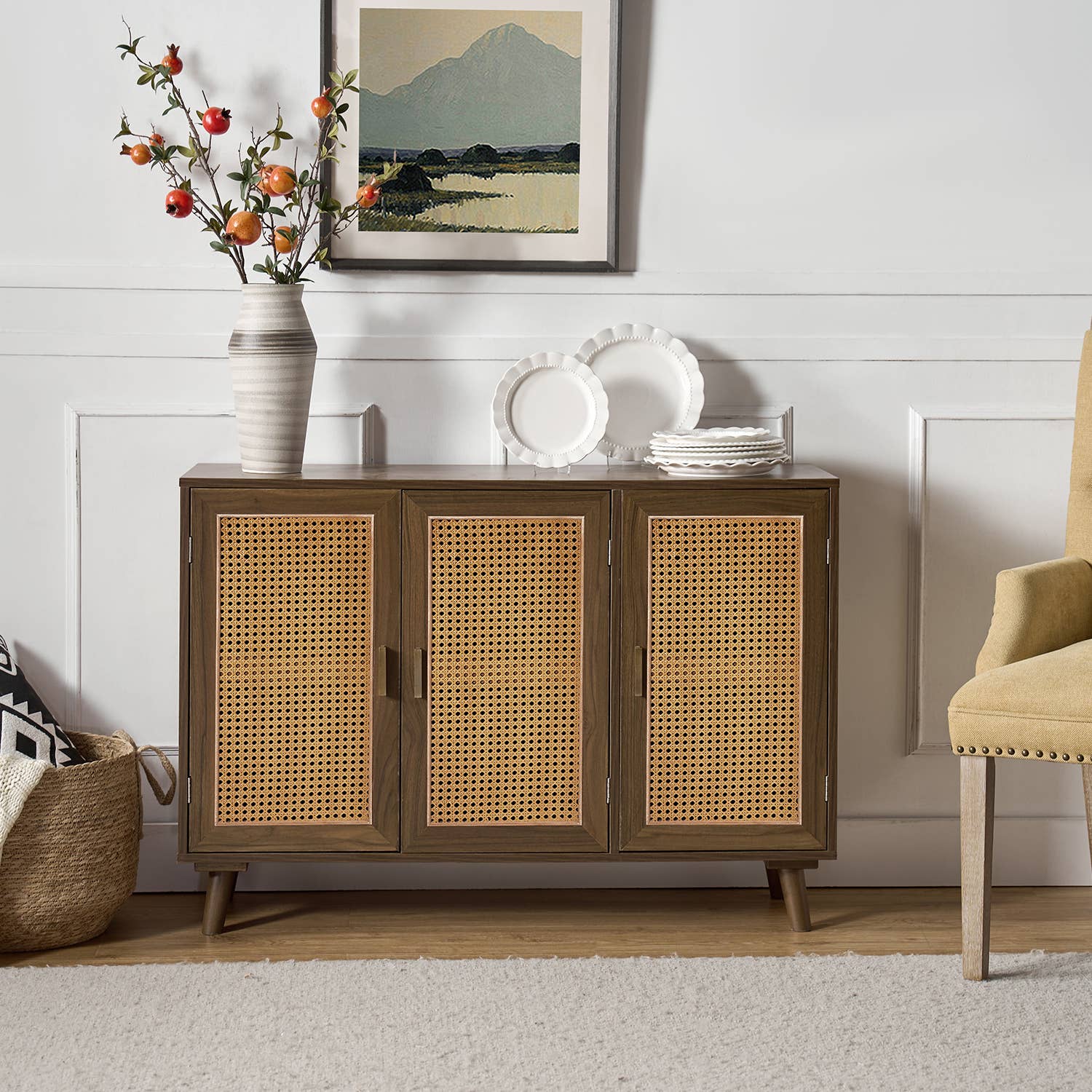 Storage vessels don't have to be unsightly. Increase your storage space and the fashion quotient of your room with this hard wearing, versatile, and good looking cabinet. This contemporary sideboard showcases a brilliant white finish that is paired with gold to effortlessly brighten any space. Crafted from durable manufactured wood, it features stunning carved geometric detailing that adds depth and character. The elegant gold hardware complements its modern aesthetic, making it a fabulous focal point. With ample shelves concealed storage and intricately designed doors, this accent cabinet offers both practicality and style for your living or dining area. 26-inch h x 39.75-inch w x 16.5-inch d. Multi-purpose cabinet for dining room, kitchen, living room, bedroom, hallway, or office. Some assembly is required. A compact footprint makes this a great option for a smaller space or room. Cabinets are a practical yet fashionable way to add storage to most any room in the home.