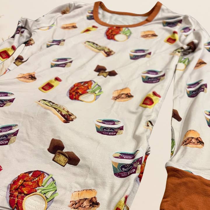 Buffalo Bites Bamboo Pajamas – For Kids Who Love Cozy Comfort & Tasty Traditions! Wrap your little one in hometown pride and buttery-soft comfort with our Buffalo Bites Bamboo Pajamas! These super-soft, breathable PJs are made from eco-friendly bamboo fabric that keeps kids cool in the summer and warm in the winter—perfect for year-round snuggles and bedtime giggles. But the real treat? The deliciously fun print featuring Buffalo’s most beloved eats! From tangy Bison chip dip and saucy chicken wings to sizzling footlong hotdogs and juicy beef on weck sandwiches, this playful pattern is a tribute to the Queen City’s iconic comfort foods. Each bite-sized detail is served up with bright colors and a dash of whimsy, making these pajamas a must-have for little Buffalonians and foodies-in-training. Why You’ll Love Them: 🍗 Made with ultra-soft, hypoallergenic bamboo fabric 🌱 Sustainable, breathable, and naturally moisture-wicking 🎨 Features vibrant, food-themed Buffalo print kids adore
