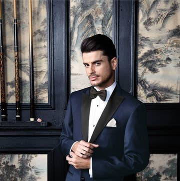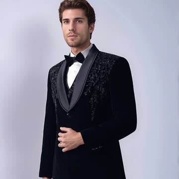 DETAILS Signature tuxedo jacket in contrasting black glitter throughout with classic satin trims, tailored for a slim fit. The suit consists of a tuxedo jacket and a pair of pants. Pants have an eight-inch difference between the chest and the waist. For example, if you choose a US38 size suit, your suit will come with 30-inch waist pants. SIZE + FIT Tailored fit, to find your correct size use the ''what's my size'' button. Ron Tomson suits and tuxedos are Drop 8, which means there is an eight-inch difference between the chest and the waist. For example, if your chest size is 38 inches, your suit will come with 30-inch waist pants. If you are in-between sizes, we recommend getting a larger size and tailoring down (if necessary). Our suits have a tailored fit, which requires minimal tailoring (if any). COMPOSITION 67% Polyester, 33% Viscose Made in Turkey Style #R187-01 CARE Dry Clean Only This look featuring model Noah Steinbuch @noahsteinbuch is wearing a size 40