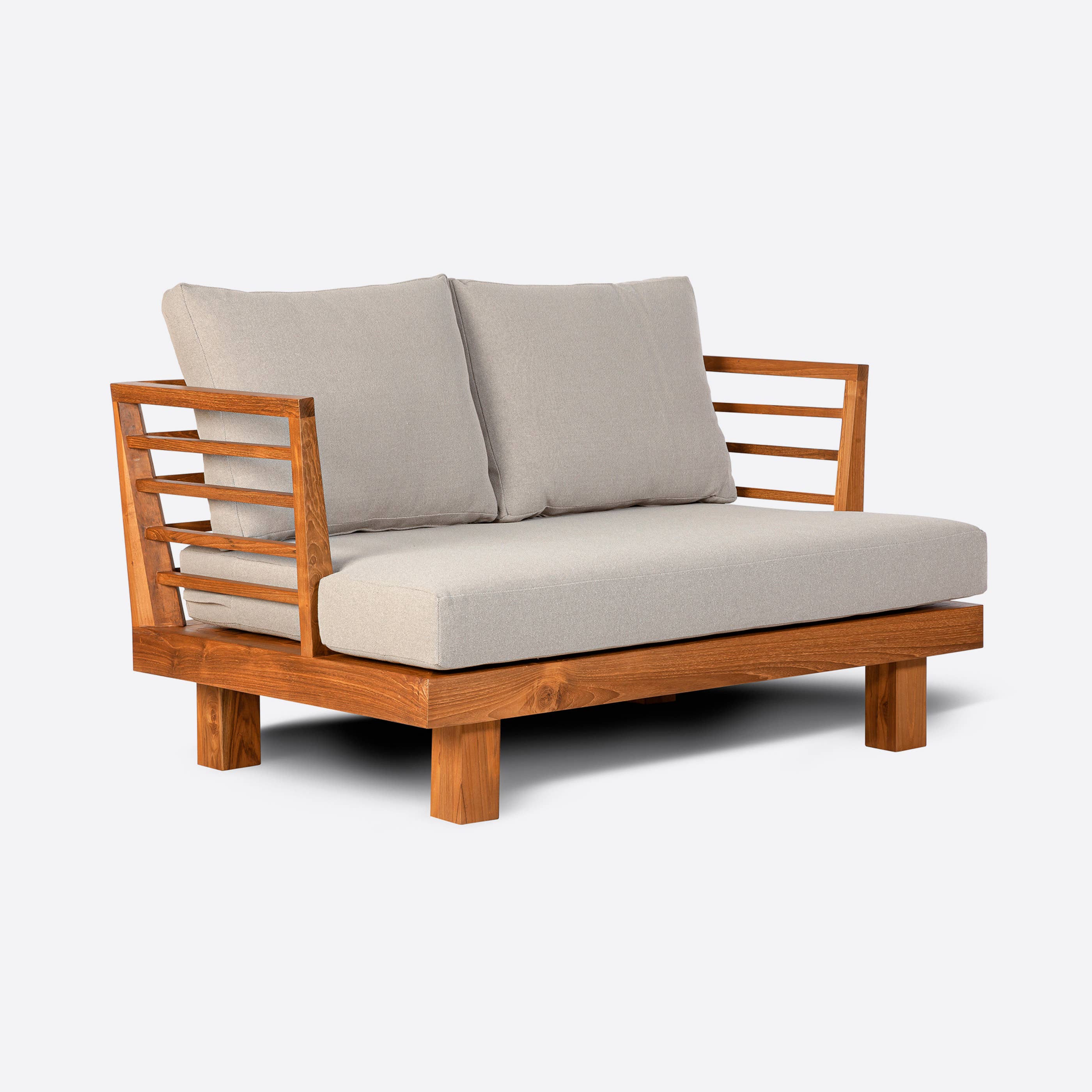 The TOPRAK outdoor sofa is one of our iconic outdoor products. It is an elegant piece of furniture, handcrafted from teak with a natural finish. The design of its back, with vertical slats that close at the sides to form armrests, combines style and functionality. The upholstery of the mattress and cushions is made from olefin, a 100% recycled yarn from textile waste, which offers superior resistance to water, mould and sunlight. The TOPRAK outdoor sofa is available in two upholstery colours and three combinable sizes: 1-seater, 2-seater and 3-seater.