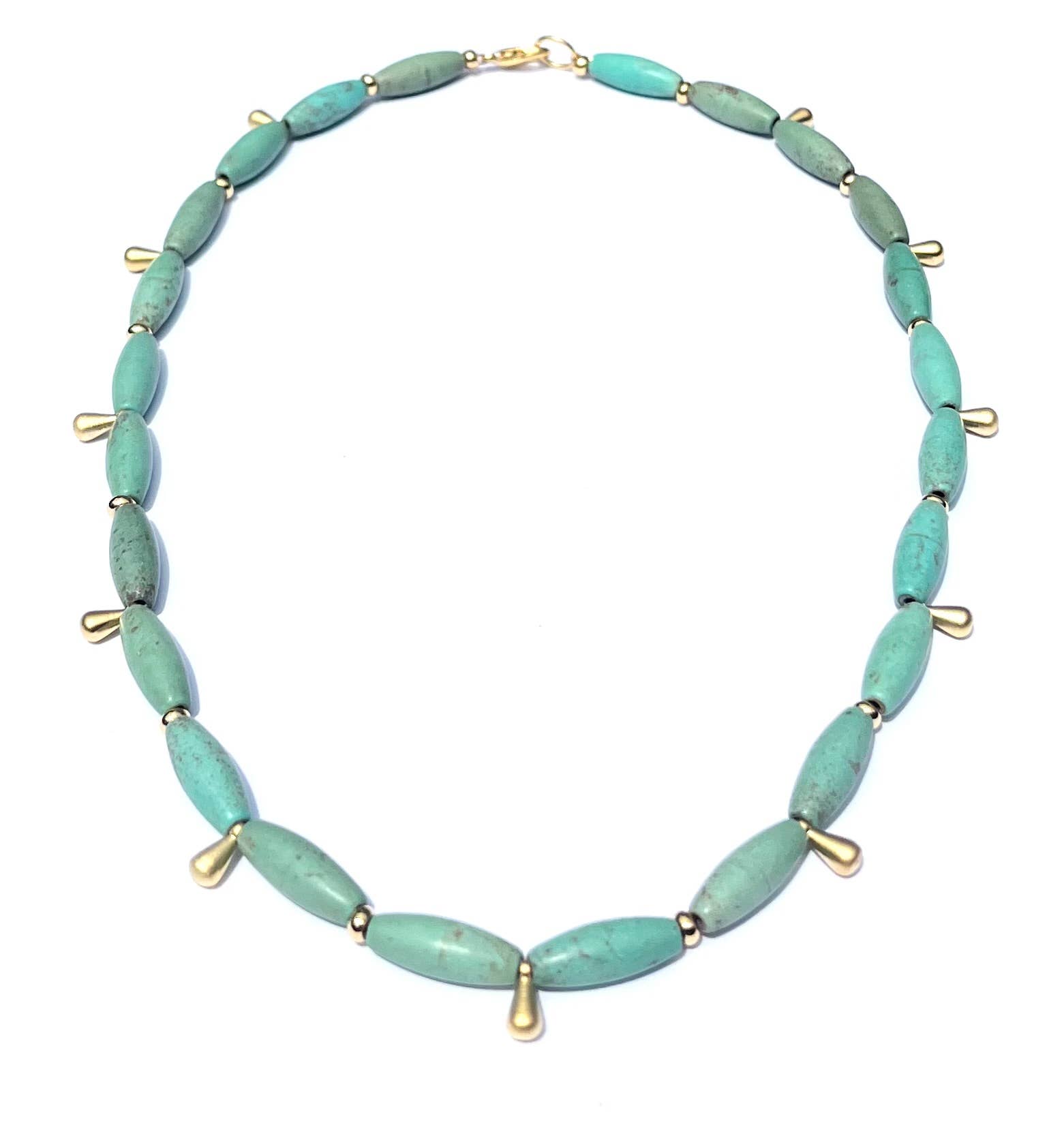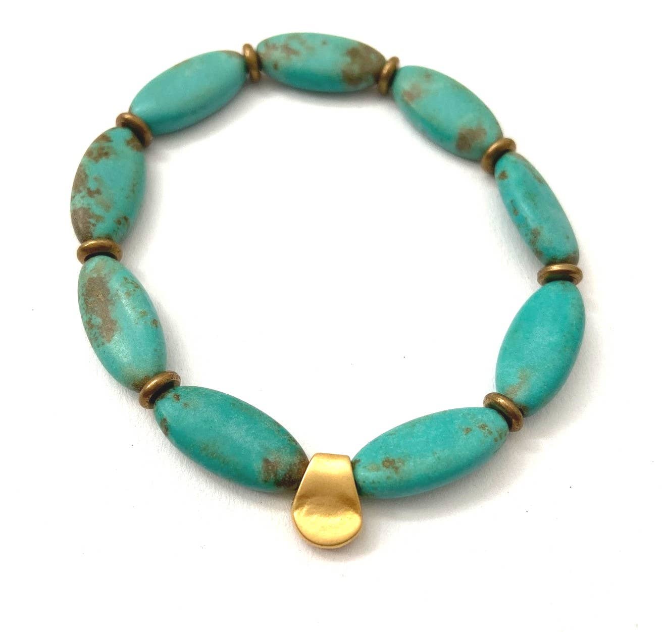 Beautiful turquoise magnesite oval beads with brass & 22K gold plated detail on stretch. These make the perfect duo stacks for beach days! Length: 7"/ adjustable Color: Turquoise