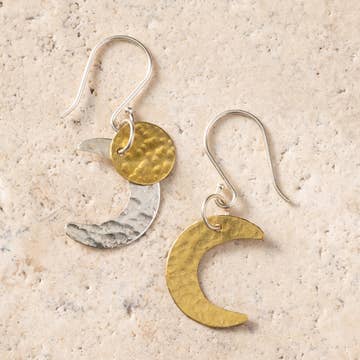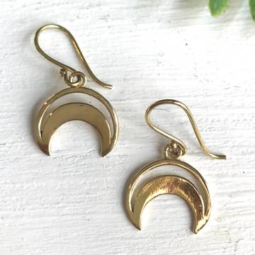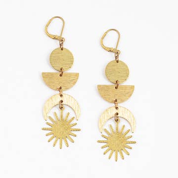 This is a pair of celestial inspire sun and moon earrings. Bohemian style brass star and crescent moon dangle from simple gold plate ear wires. These astrological earrings measure approx 2 1/2 inches from the top of the ear wire to the bottom of the charms..