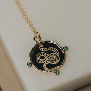 The serpent is one of the oldest and most widespread mythological symbols. It signifies fertility, rebirth, transformation, immortality, and healing. Intriguing handcrafted etched small serpent pendant. This necklace is completed with a standard chain in an 16" long with a 2" extender. Pendant size 18mm l x 10mm W.