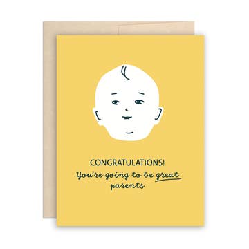 Front: A BAY BAY! CONGRATS!" (Baby 1) Inside: Blank. Perfect for: Baby, Baby Shower or New Baby. Details: A2 (4.25" x 5.5") card. Printed on thick uncoated, recycled card stock. Paired with a 100% recycled A2 peel and press grocery bag kraft envelope. Packaged in a cellophane sleeve. Tiny Gang Designs logo on the back. All cards are housed in a clear cello sleeve to keep them safe until you're ready to sign, seal and deliver, doll!