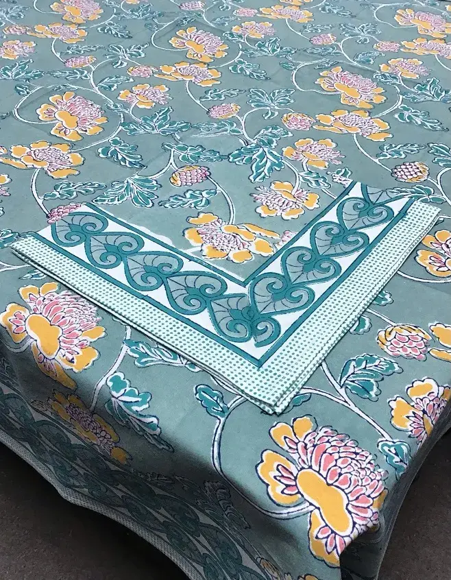 Block tablecloth 60x90 Machine wash cold. Gentle cycle. Do not bleach. Air dry. Handblock printed table cloths. 100% cotton