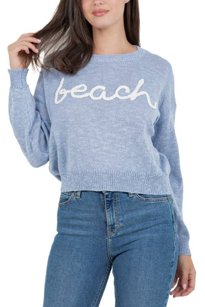 This knit sweater boasts a stylish "Beach" graphic, perfect for any beach day. Stay cozy and trendy with this must-have piece.