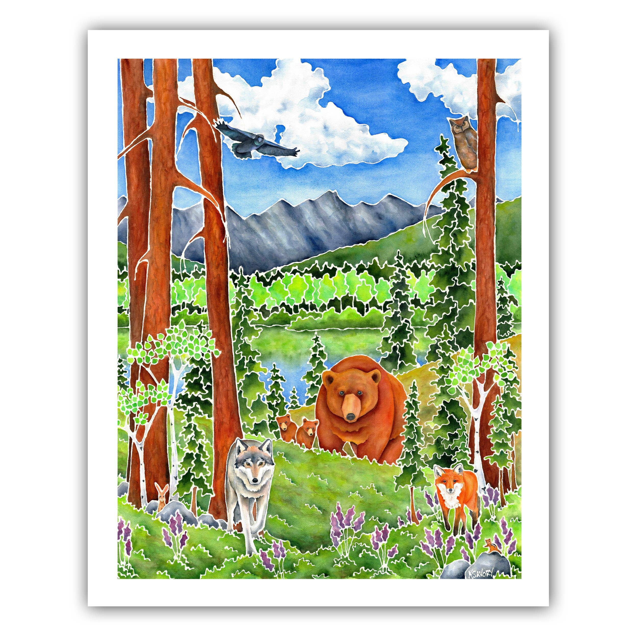 8x10 or 11x14. High-quality paper print. From original artwork by Karen Savory. Made in Montana. Packaged in a sealed eco-friendly compostable clear bag with a recycled backer board, the color will vary. Frame not included.