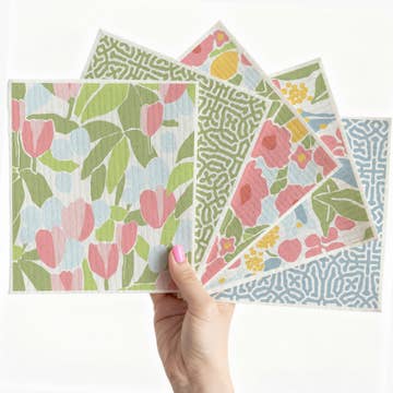 Do you know any Swedes? Ok me either, but I am in love with how the Scandanavian countries live and their dish cloths? To die for! Not only are they good for the environment, they are also highly functional, versatile and of course gorgeous, because why would you clean with anything that wasn't pretty?! Replace your sponges and paper towels and use these thick, durable, non abrasive cloths to clean ANY service! Designed to absorb absorb like a sponge and wipe like a cloth, they can soak up to 16 x their weight in liquid! Eco friendly - made out of 70% cellulose pulp and 30% high grade cottonm and printed with water based inks Compostable - they will desintegrate in 4 weeks in a household compost! Last at least 6 months, Clean in dishwasher or washing machine and can be machine dried. Measure 6.75x 8 inches Low stock items will be ready to ship at the end of February.