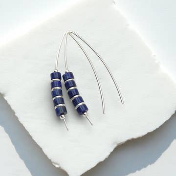 Earrings, blue glass seed beads, sterling silver, longer pair about 2.75 inches long, shorter pair about 1.75 inches long.