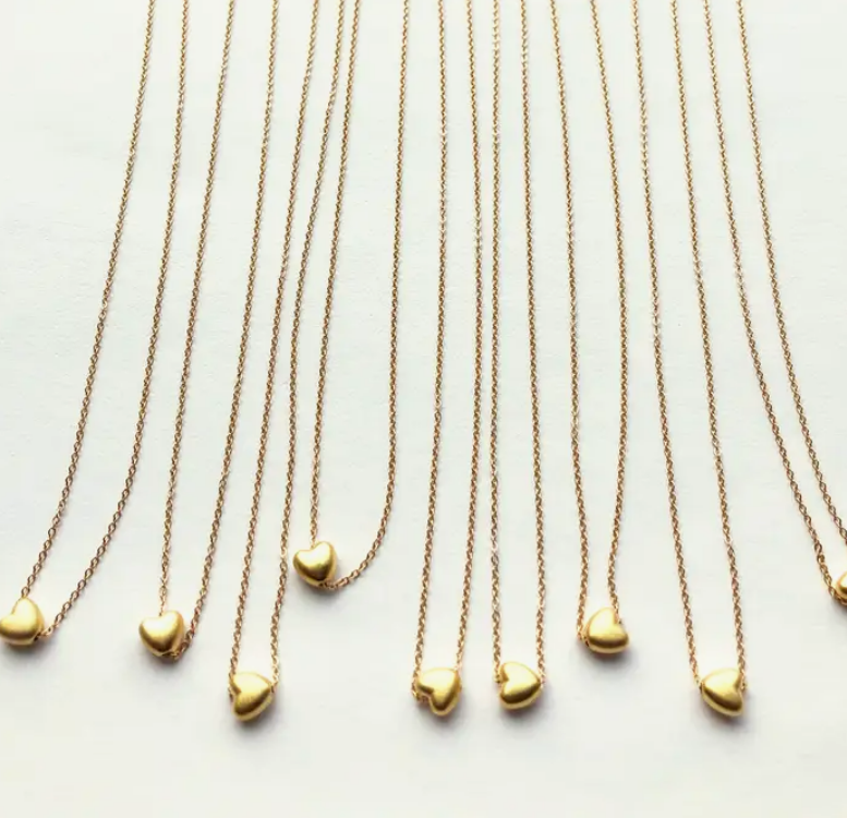 A petite heart lays sideways for the perfect minimalist necklace. This necklace makes a great everyday piece of jewelry. Perfect as small gifts. + 14K Gold Plate Heart. 14K Gold Fill Chain. Spring Ring Clasp. + Length: 16 inches. Heart Necklace • Minimalist Necklace • Valentine's Day • Dainty Necklace • Small Gifts