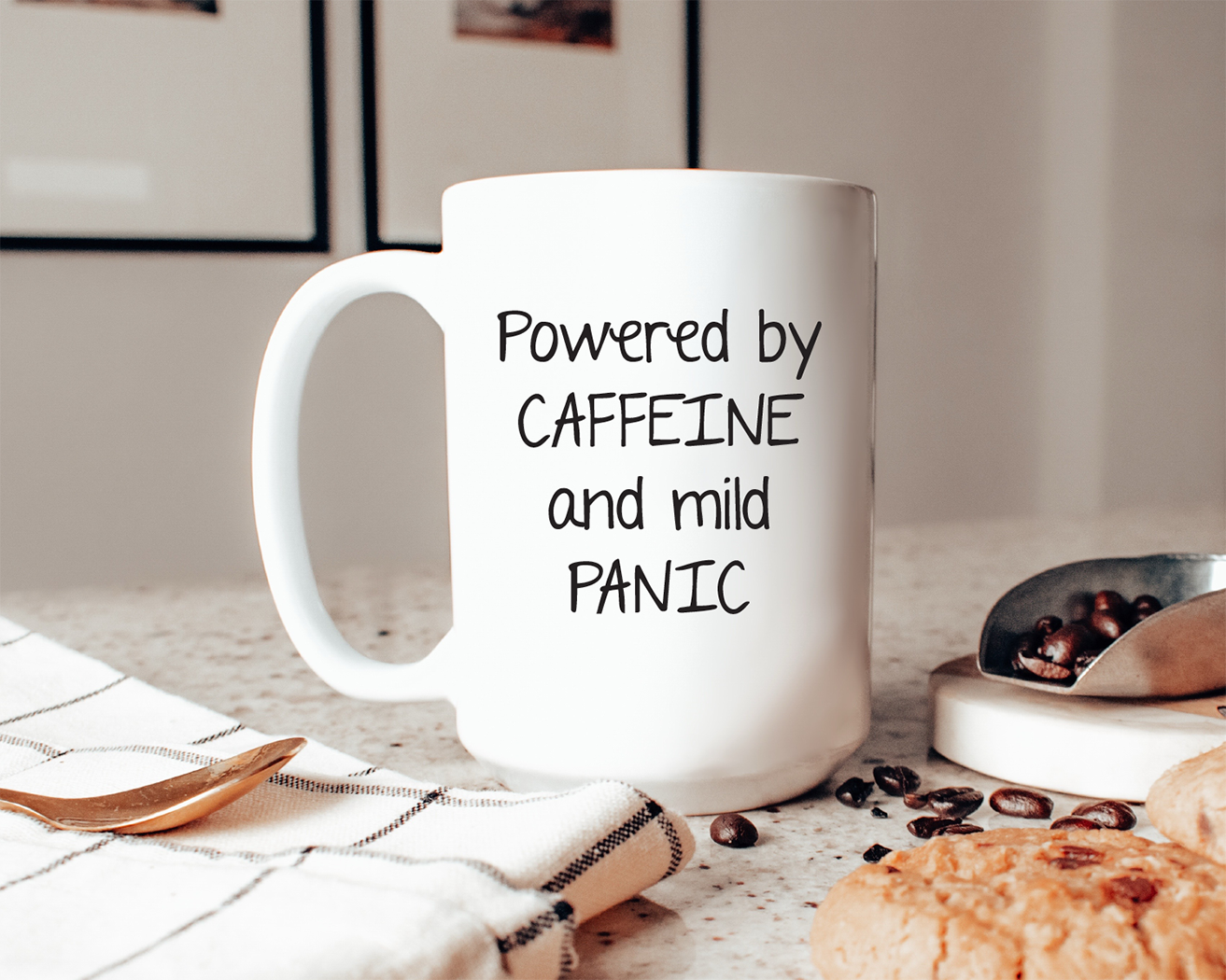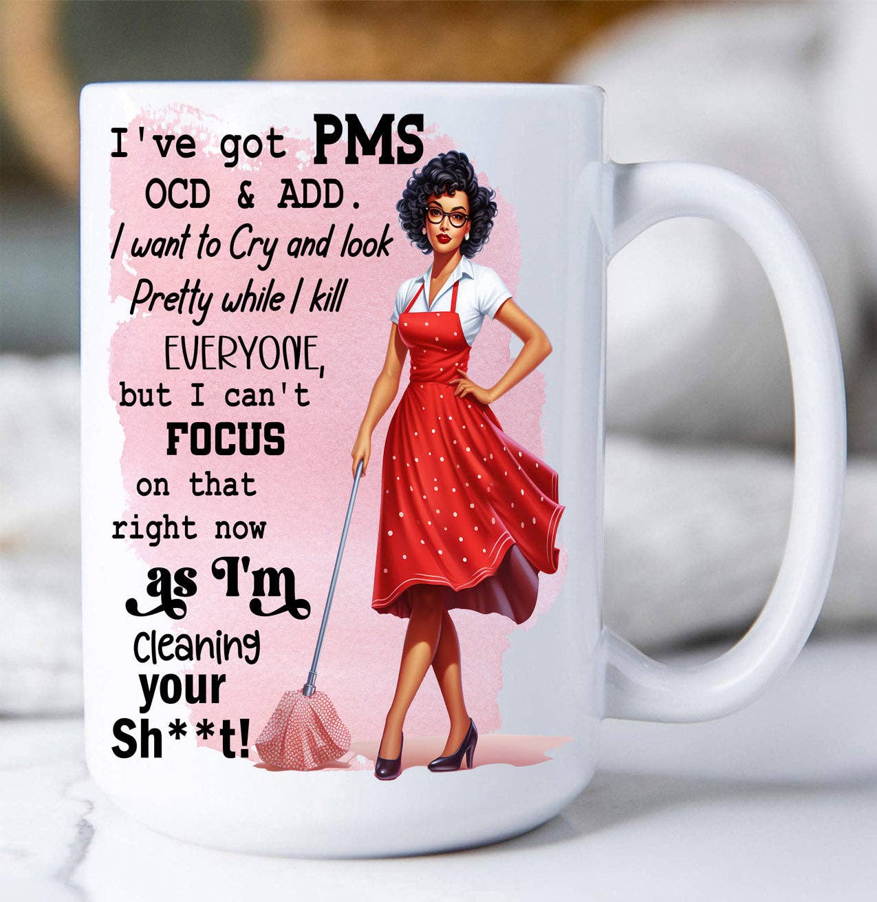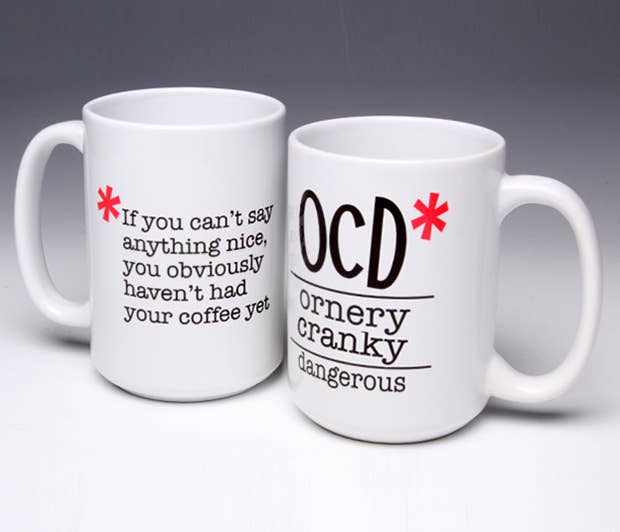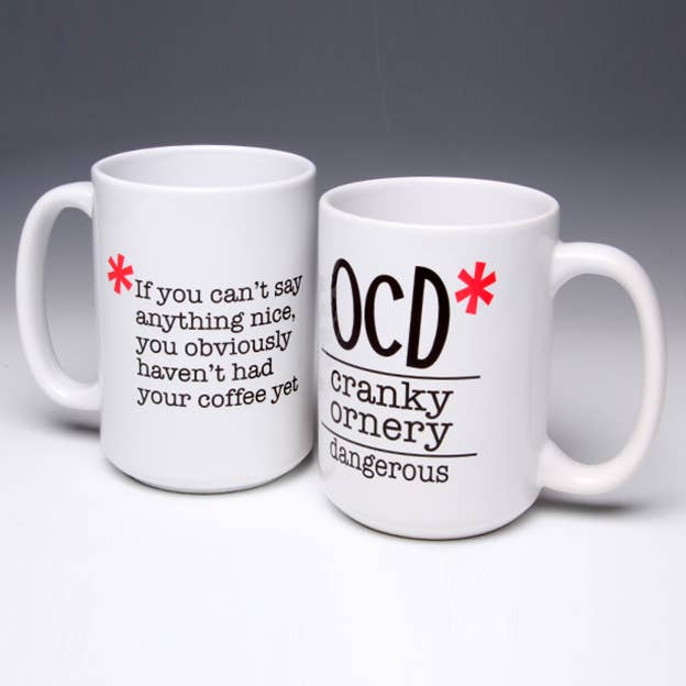 NEW FOR 2019! This whimsical OCD* 15 ounce ceramic mug can be personalized. Image wraps around both sides of the mug. Dishwasher and microwave safe, this mug is designed and hand-printed in my NJ studio. Packaged with a gift tag. Who do you know who has a coffee obsession, LOL?