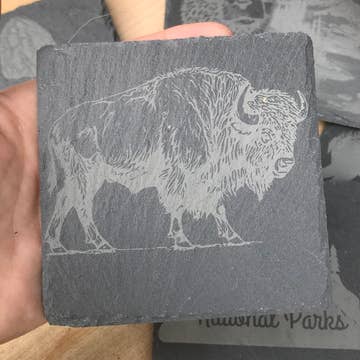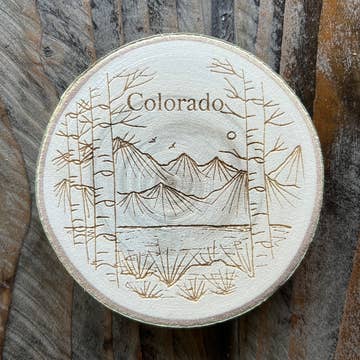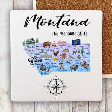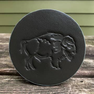 Leather Coaster - Montana Curate a collection of our handmade leather coasters and watch your customers marvel and laugh while they purchase individual coasters OR mix and match their own custom set. Our handmade leather coasters are top quality! Each coaster has two plies of leather glued together, the sides are sanded and painted to match the top leather, heat stamped, and cork backed. We ship in ASSORTED COLORS so you will receive 5 of each design in different colors. We have yellow, orange, red, burgundy, kelly green, turquoise, royal blue, grey, caramel, brown, and black. BRIGHT COLORS SELL THE BEST!!! If you don't like a color let us know. If you want specific colors let us know. If you want all one color (we highly discourage this) we can accommodate. Blank cork backs available. CREATE YOUR OWN CUSTOM DESIGN