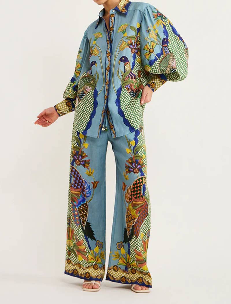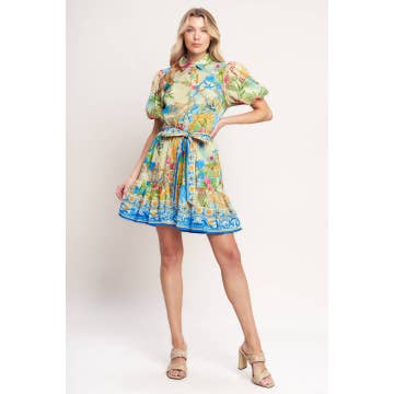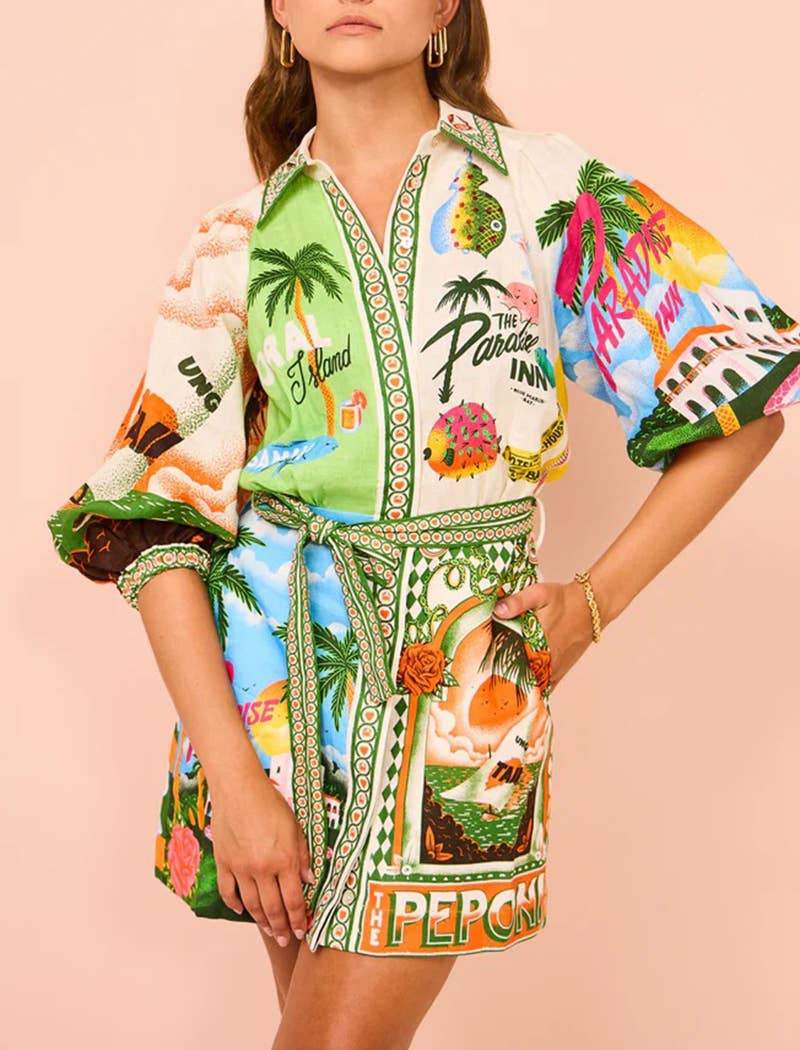 This dress showcases an artistic print with unique graphics. The button-down style and skirt overlay create a playful yet sophisticated look. Ideal for those seeking a bold statement piece for their wardrobe.