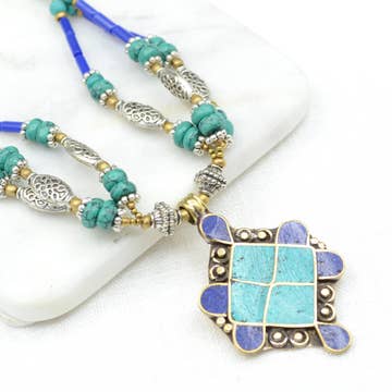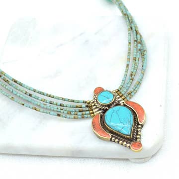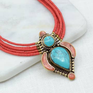 Gorgeous turquoise and red stone necklace with brass heart shaped pendant inlaid with turquoise and red stone. Traditional Tibetan handcrafted beads, small silver and brass beads further augment this piece. Materials: Turquoise and coral pendant; turquoise and coral beads. Length: 17" long Handmade in Nepal: may contain slight variations