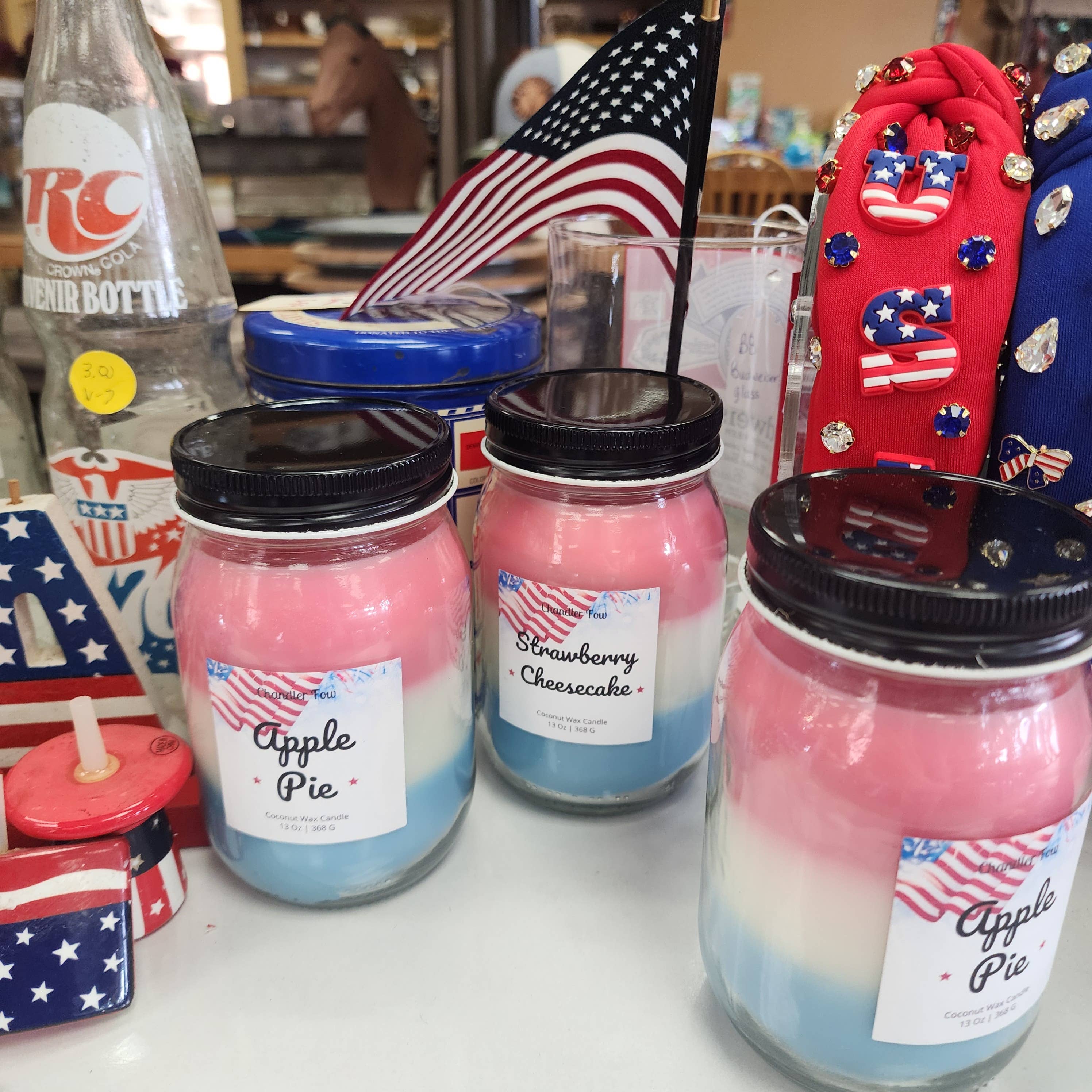 The Memorial Day collection includes America's favorite baked goods! Apple Pie, Blueberry Cobbler, and Strawberry Cheesecake. 13 Oz coconut wax candle. 100% cotton wick. Total burn time approximately 80 to 90 hours. Why you'll love our coconut wax blend! -Clean burns top to bottom. -Highly scented top to bottom. -Coconut wax is a much softer candle wax than paraffin or soy, therefore not prone to tunneling. Feel at ease knowing you won't ruin your candle by blowing it out early. -121 degree melt point guarantees your candles will not melt during shipping. -Trim wick short. 3/16" to 1/4" max. Do not burn more than 4 hours at a time. Keep out of reach of pets and children. Never leave burning candles unsupervised.