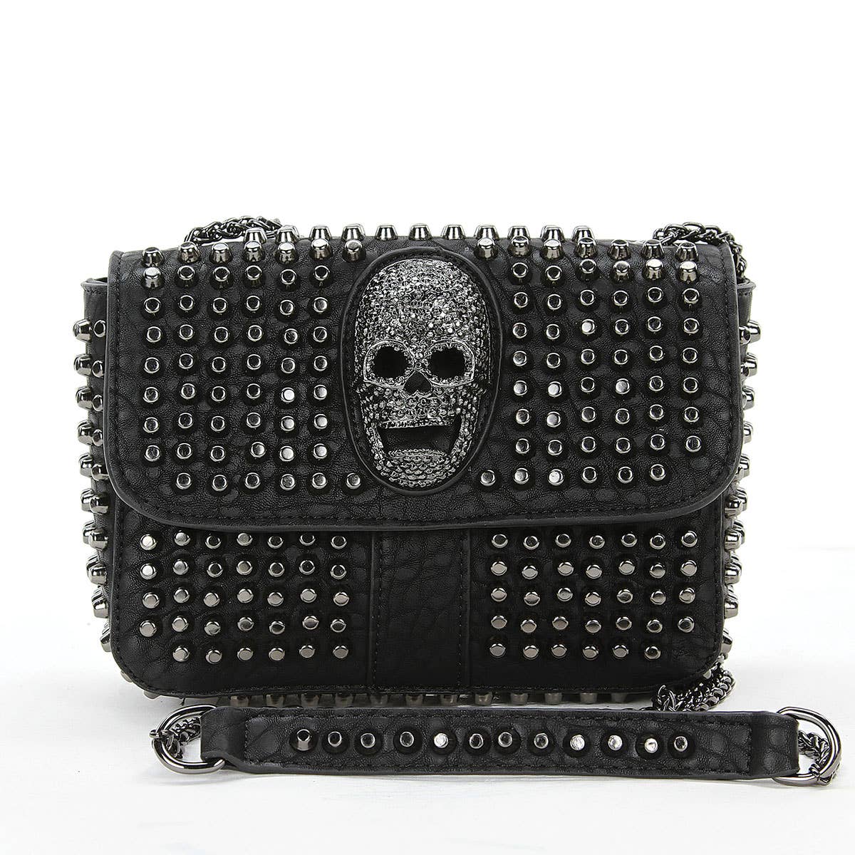 Introducing our Skull Women's Crossbody Leather Phone Wallet, measuring 8 by 5 by 2 inches and weighing 14 ounces. This stylish wallet includes an attachable wristlet strap and a long 24" crossbody strap. This phone case wallet offers both portability and functionality. The front pocket, measuring 7.5 by 4 inches and secured by a magnetic flap, is perfect for carrying your smartphone. The size should accommodate most popular smartphones, depending on the phone case. Additionally, the attached zipper wallet provides convenient storage for your cards and cash, while the crossbody strap allows for hands-free and convenient use. The skull motifs add a touch of attitude and rebellion to the wallet, capturing a sense of individuality and self-expression. The studded detailing brings a playful and sexy element, creating a dynamic and eye-catching look. Embrace your unique style and make a bold statement with this trendy accessory that will elevate your look and turn heads wherever you go.