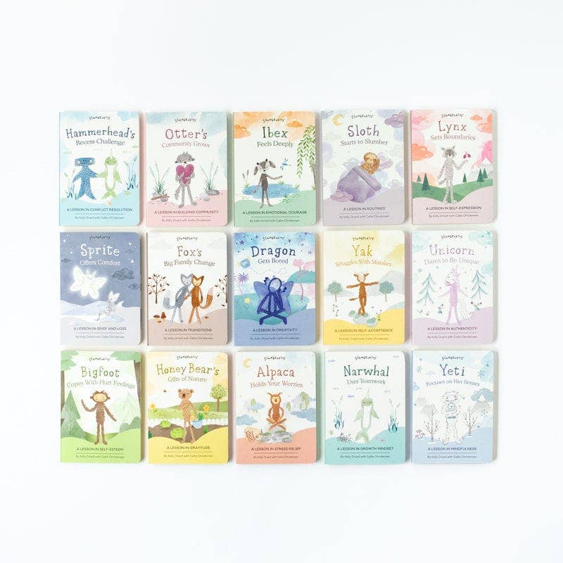 The Slumberkins Board Book Library features 16 of our skill-building "Introduction to" board books. Each book supports a specific early emotional skill and will be the perfect addition to a classroom book collection. Board Books Include: Alpaca Will Be There Board Book Bigfoot, You are Lovable Board Book Dragon Dreams and Creates Board Book Fox, Your Love Stays the Same Board Book Hammerhead, Mad's Not Bad Board Book Honey Bear, I'm Grateful For You Board Book Ibex Greets His Feelings Board Book Lynx , Trust Yourself Board Book Narwhal, I Believe In You Board Book Otter's Heart Family Board Book Sloth's Daily Plan Board Book Sprite Helps Say Goodbye Board Book Unicorn Let Your Light Shine Board Book Yak, You Are Good Enough Board Book Yeti Grerets The World Board Book Creatures Full of Feelings for Emotional Well-Being