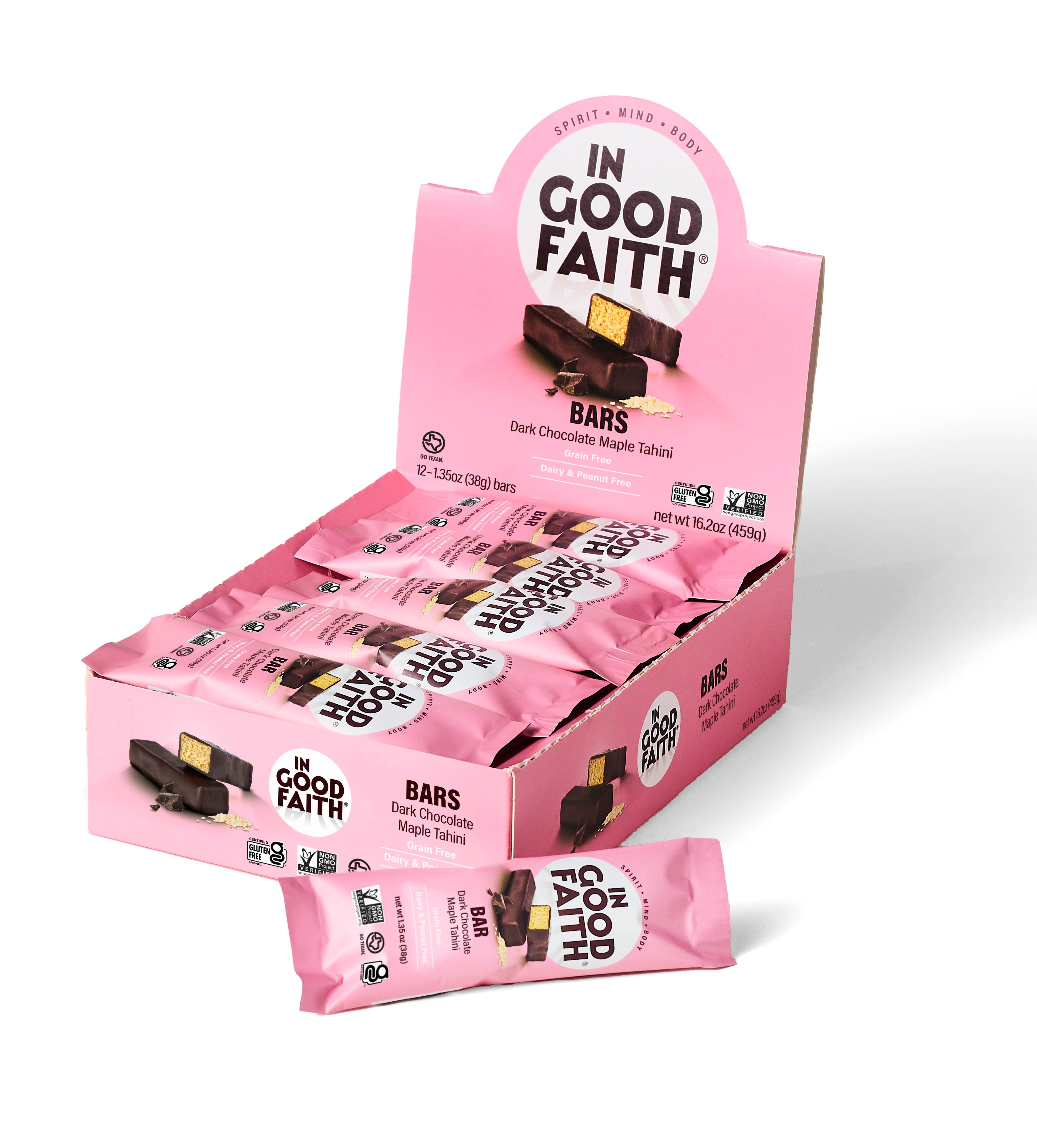 Delicately crispy layers of maple and tahini, enrobed with coconut sugar sweetened dark chocolate. Naturally sweetened with coconut sugar and maple syrup. Non-GMO Project Verified, Certified Gluten Free, Seed Oil Free, Refined Sugar Free, Dairy Free, Grain Free, Egg Free and Soy Free. 12 Bars per Carton; 2 Cartons per Case (24 Bars Total). MSRP (per bar): $2.79 - $2.99