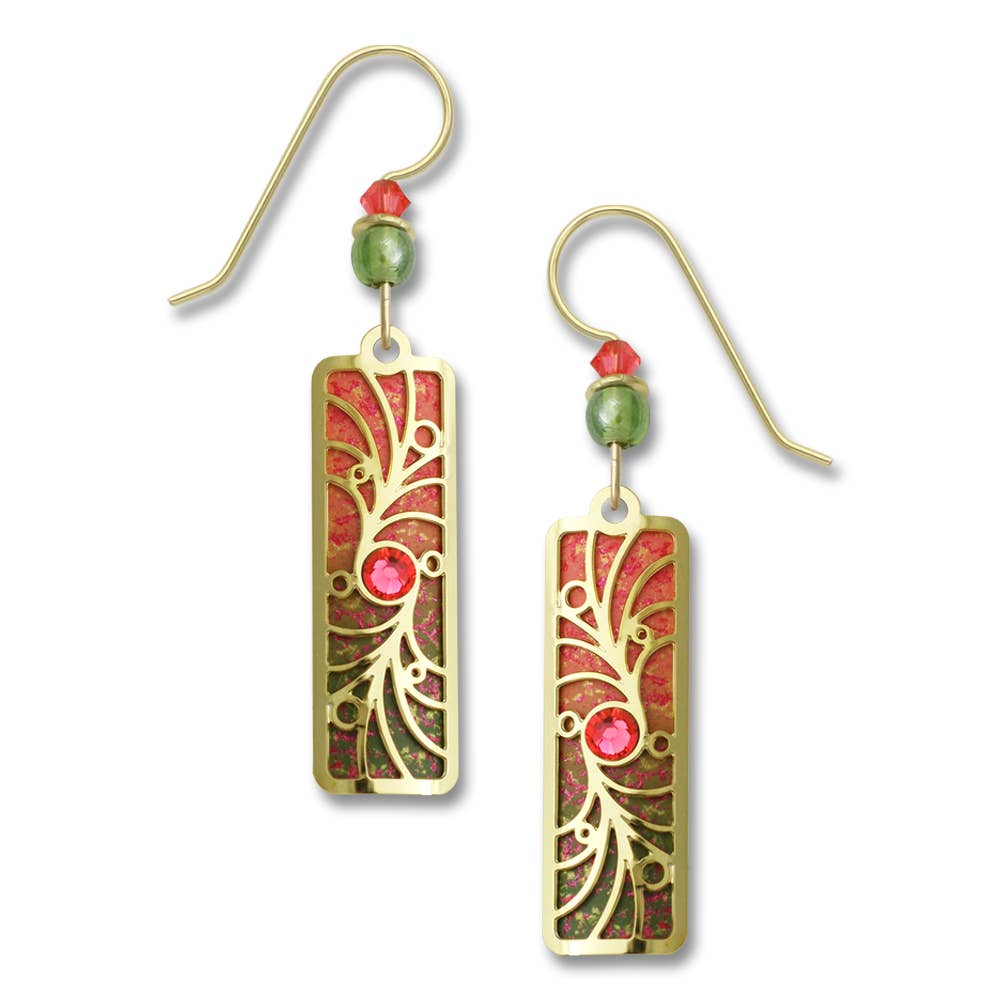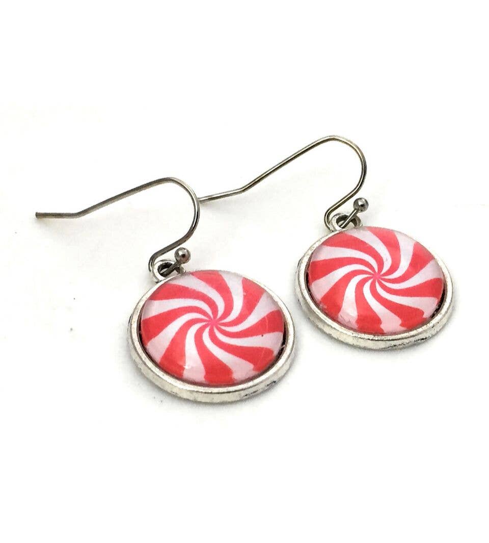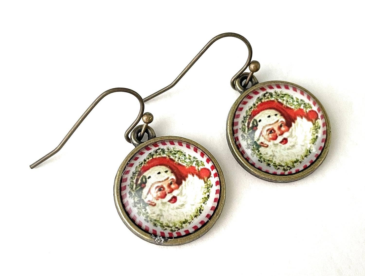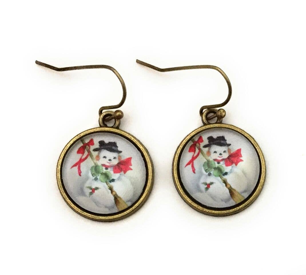 These dangle earrings feature an image of a red Christmas ornament with a swirled glitter accent. Each cabochon is set into an antique brass alloy tray. The earrings are 0.64 inches - or about the size of a dime and have a dangle earring wire. Earrings come carded with plastic stoppers and in a clear envelope. Fern & Filigree cares about the environment and donates a portion of our proceeds each year to organizations that support pollinators.