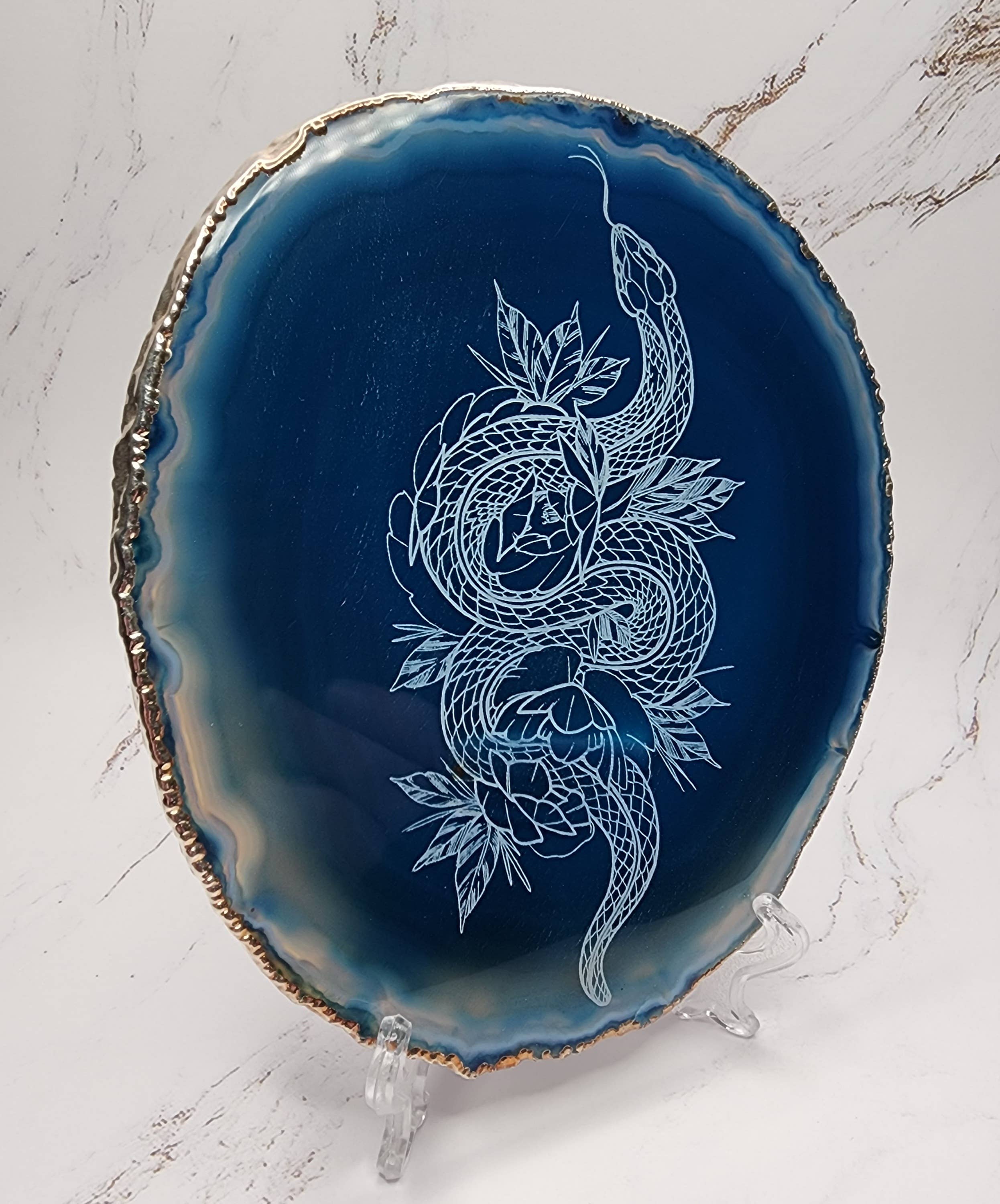 The perfect gift for every Astrology lover! The Zodiac Goddess Collection from Fractalista Designs features an enchanting array of zodiac-themed agate slices. Each piece is meticulously crafted to embody the unique attributes of the zodiac signs, offering a personal and mystical touch. These agate slices not only serve as stunning decorative items but also as symbols of personal connection to the cosmos. *Please Note* The agate you receive may not be the exact agate from the photo. Agate colors are selected at random based on availability.
