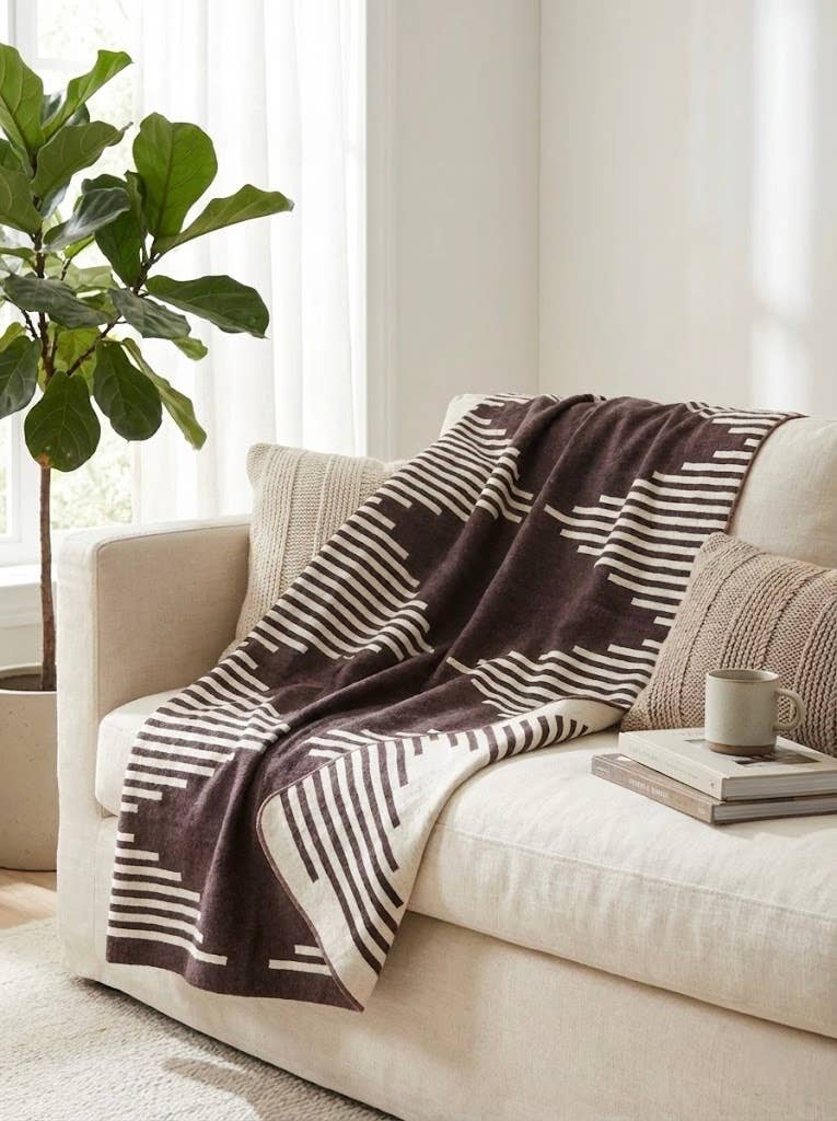 Elevate your interior with the timeless charm of the Manhattan Throw. Featuring three bold stripes on each end, this oversized wrapable throw blends modern minimalism with cozy warmth. Perfect for draping over a chair, sofa, or wrapping around your shoulders on a chilly evening. - 10% cashmere 90% Superfine Merino Wool - oversized at 55 x 78" - 240 gms - designed in Canada - made in Ukraine - dry clean only