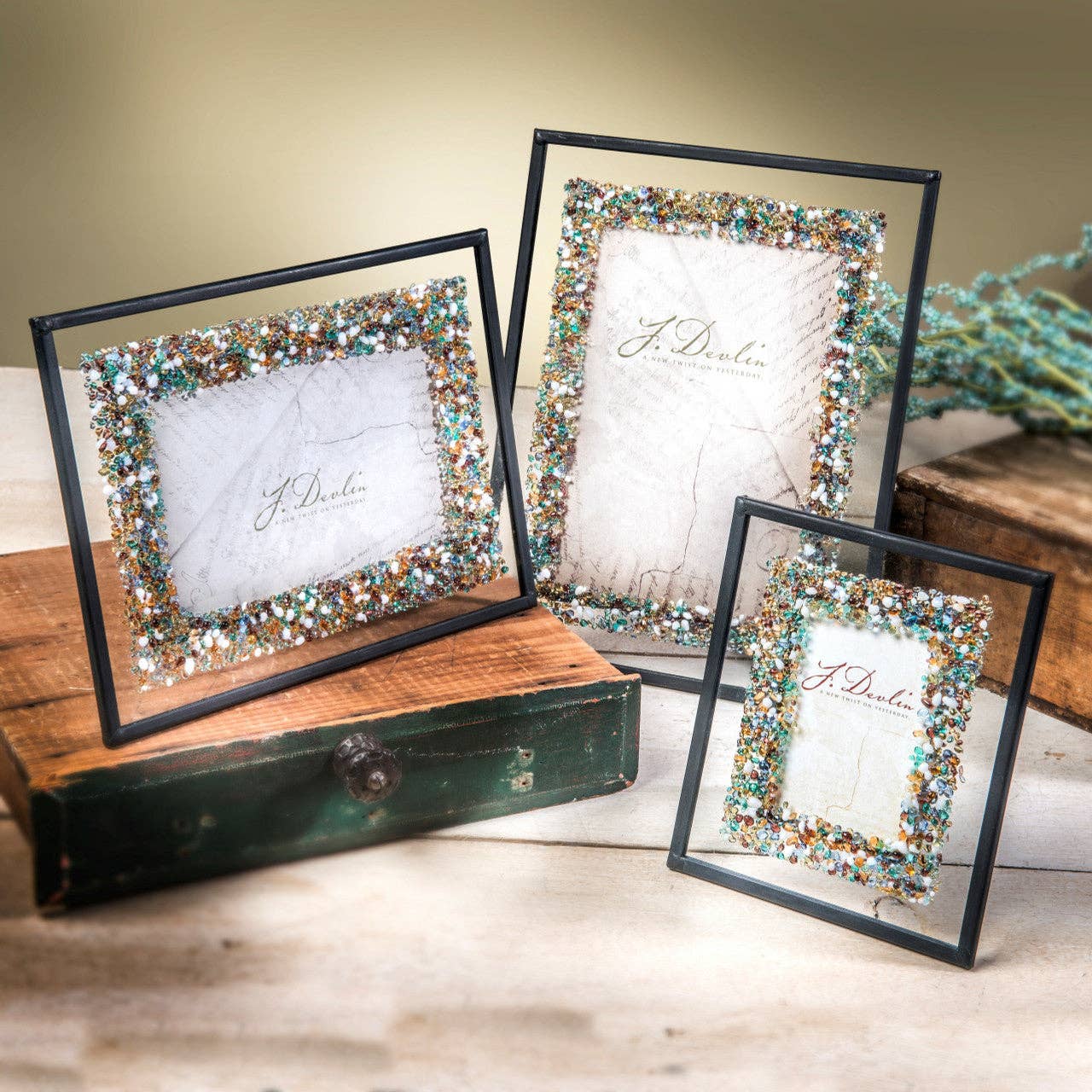 Simple in design, soft in color this photo frame has a fresh clean look that works well with any home decor style. This tabletop picture frame has an easel back allowing it to be used horizontal or vertically. The metal trim and solder have been antiqued with a charcoal patina and waxed to keep it beautiful for years to come. All J Devlin products are made with lead free solder to protect you and the environment. Each picture frame is carefully handcrafted by skilled artisans using a copper foil and solder technique developed by Louis Comfort Tiffany in the late 1800’s. This age-old art form combined with 21st century designs creates the perfect combination for unique home décor. Other colors are available in this style and make a colorful display when paired together. Co-ordinating items: Pic 324, Pic 325, Pic 369, Pic 322, Pic 410.