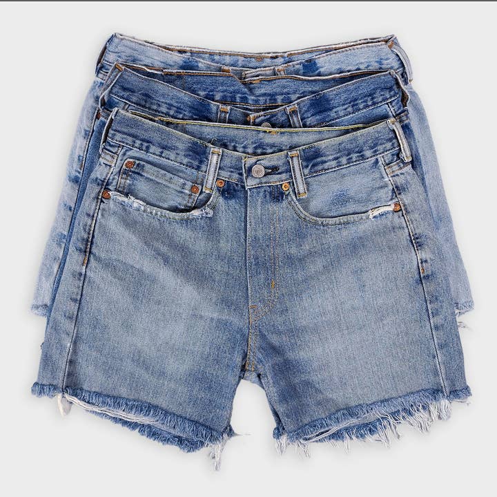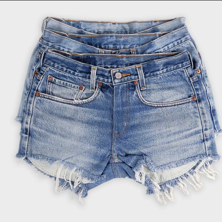 Meet your go-to summer essential: Upcycled Denim Shorts! Each pair is reworked by hand from secondhand levi jeans, blending sustainability with laid-back western inspired style. Perfectly broken-in, and totally unique—no two pairs are the same. SIZING* Sizes 00–12 US (waist 26"–34"). See size chart for details. *Sizing is approximate. Please expect variation among pieces of the same size, due to the nature of secondhand/vintage items being uniquely produced and pre-washed. SUGGESTED PACKS 12-pack 2-2-2-2-2-2, (size 00-8) 12 -pack 1-1-2-2-2-2-1-1, (size 00-12) 16-pack, 2-2-2-2-2-2-2-2, (size 00-12) CONDITION** Denim is washed. Items are generally in good condition. As with all secondhand/vintage clothing, signs of wear are present, but there are no outstanding flaws. Typical characteristics of this product may include fading, fraying, minor stains/discoloration, or distressed marks—each adding to the garment’s unique charm and lived-in appeal. **All orders contain reworked secondhand clothing in grade A condition (no major holes or stains) with up to 10% grade B (minor stains, holes or rips smaller than a dime). Please note we do not manufacture the garments. That said, we pride ourselves on curating consistent quality for all orders big and small. MATERIAL(S) Vintage Denim sku #501, Upcycled Vintage Denim Shorts - Original Cut-Offs #levis #levisjeans #denimshorts #cutoffshorts #jorts