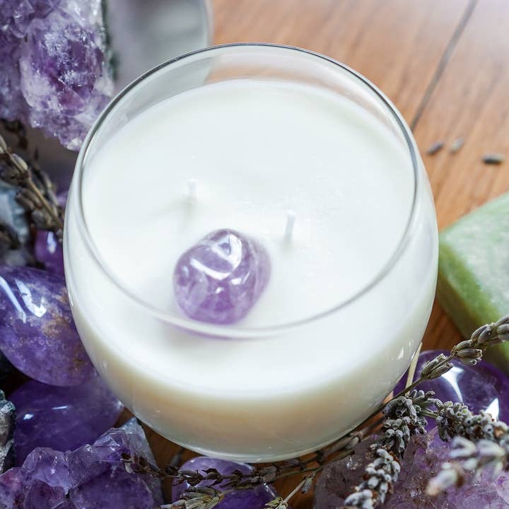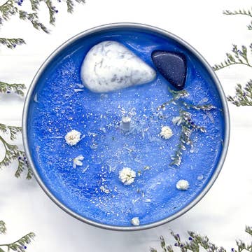 Artisan juniper, lemon, basil and kyanite, sodalite soy candle.