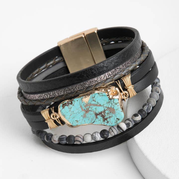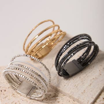 "This Scarlett beaded bracelet design is simply beautiful. It can be worn to the movies, on a date, or even at a wedding. It’s simple yet elegant, featuring strands of metallic square beads complemented by shimmering rope-like strands for added texture and depth. Finished with a convenient magnetic bracelet clasp, it offers both style and ease of wear. Its layered look makes it a refined bracelet stack that is anything but basic. Materials: Gunmetal, Zinc, Copper Size: 7.5” x 0.75” Magnetic Clasp"