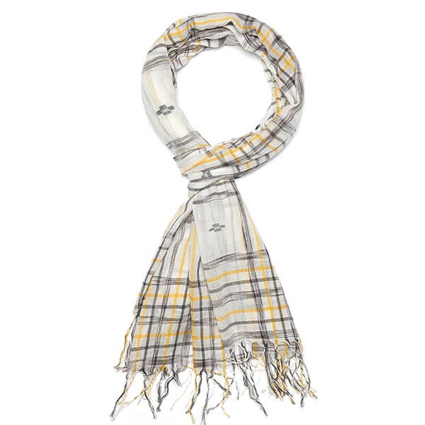 Hand-dyed 'IKAT' brushstrokes of green and blue create a geometric pattern on this cream-colored scarf. It is also accented with 'kantha-like' stitches in turquoise. 80" x 27 1/2", 100% COTTON