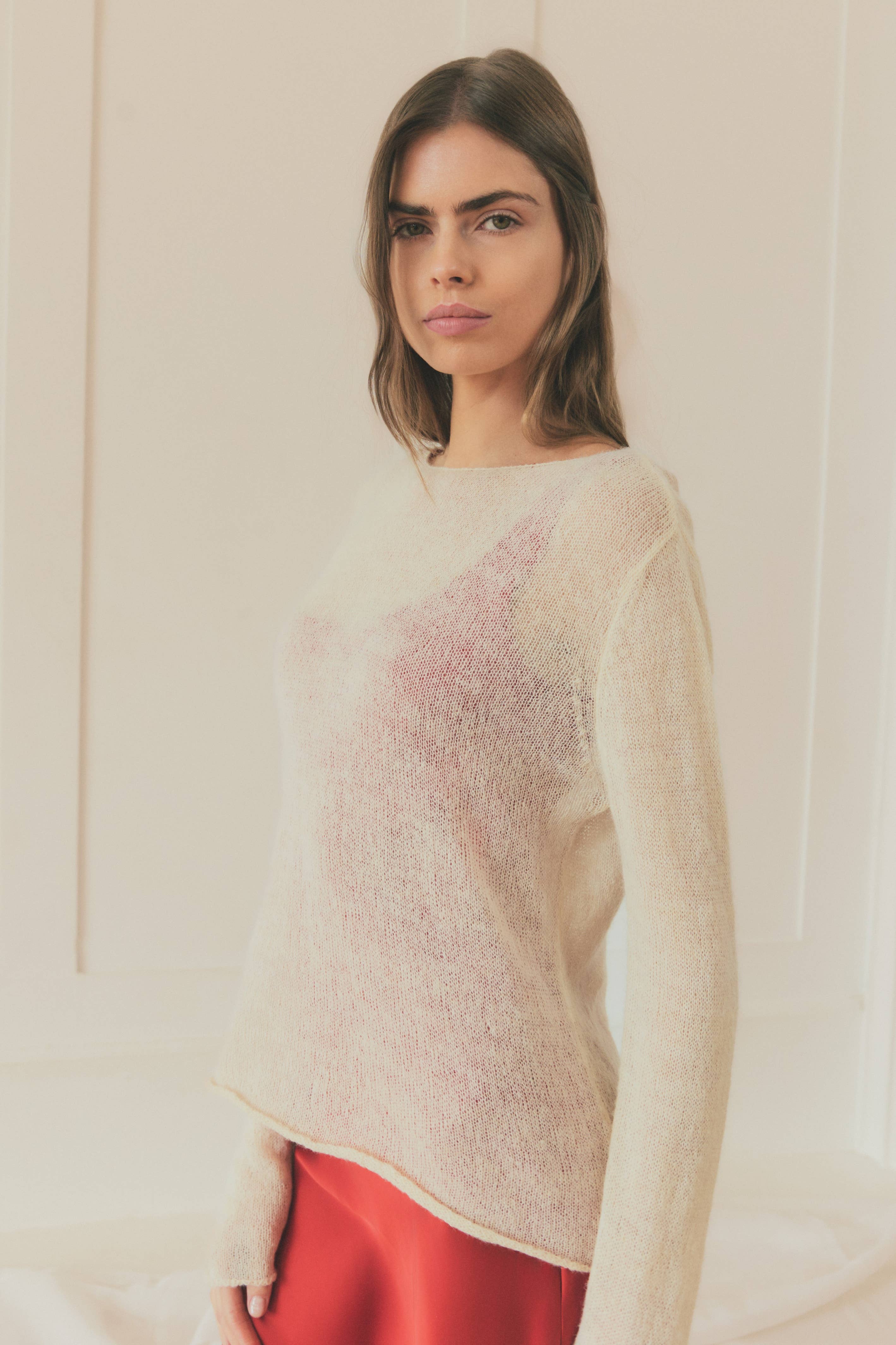 SHEER CREW NECK CROCHET KNIT SWEATER