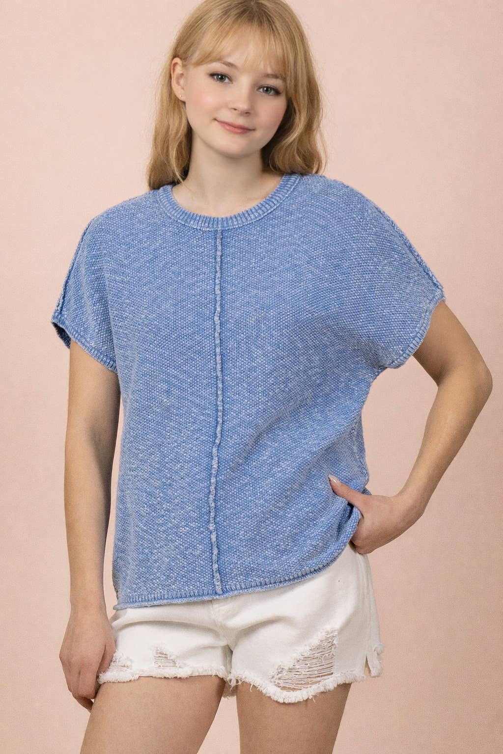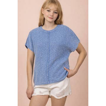 SPLIT NECK SHORT SLEEVE KNIT PULLOVER
