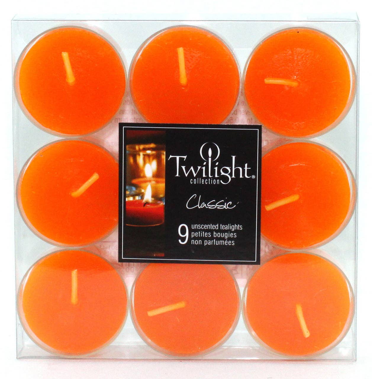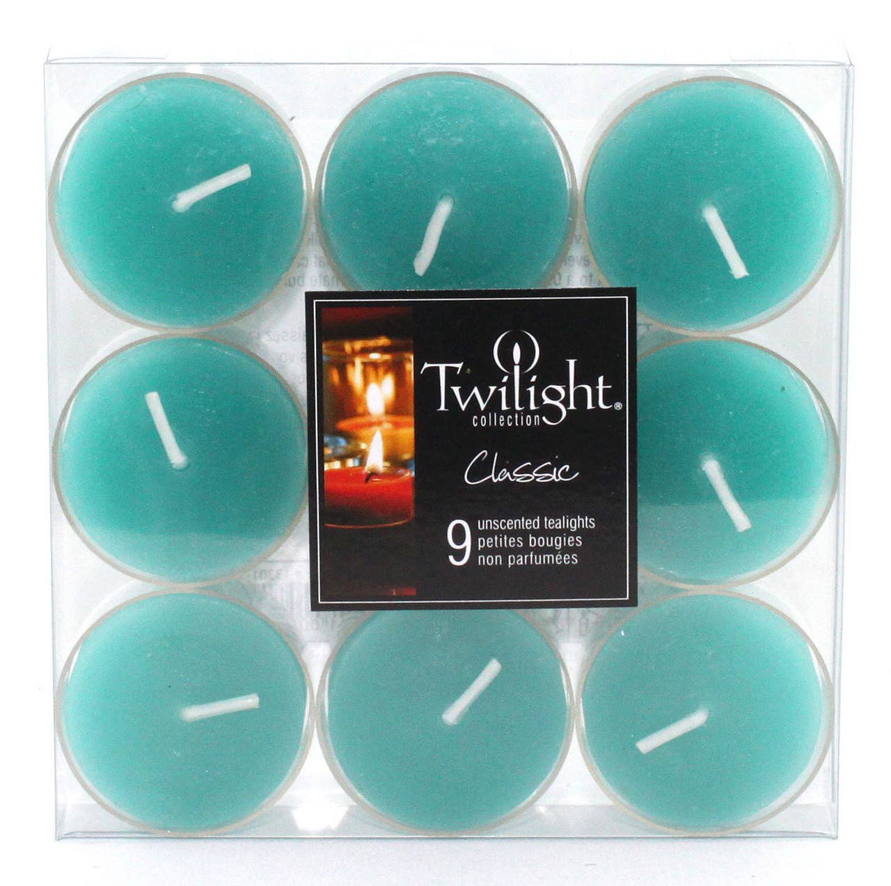 Twilight Collection Coloured Tealights - Yellow clear cup tealights. 9 solid coloured, unscented, tealights packaged in a clear plastic gift box. Burn time approximately +/- 4 hours.