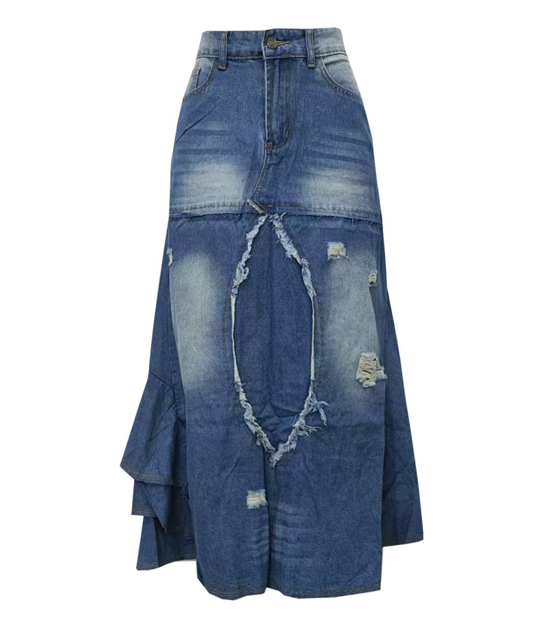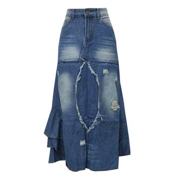 Meet the ultimate optical illusion in denim-inspired fashion. The "Skirt Mermaid" from our Jeanious collection defies expectations with its wildly detailed, high-definition print that mimics layered and shredded denim, down to every thread and stitch. But here's the twist—it’s all a print. You won’t believe it until you touch it. The maxi silhouette hugs gently at the hips and then flares out for an effortlessly flowy and dramatic shape. The raw-edged effect and textural overlays give this piece an edgy, deconstructed denim vibe while maintaining the breezy comfort of soft Spring/Summer fabric. Designed in one versatile S/M size, this piece is modeled on someone 5'6" and crafted for standout street style with the ease of all-day wear.