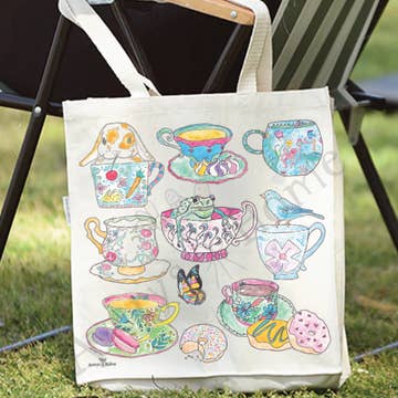 Details: - Choose from 3 colors for the handles: natural, blue, yellow - Manufactured in a fair trade factory in India with organic GOTS and Fairtrade certified cotton - Exclusively designed and painted by The Tote Project - Artwork printed with water-based, eco-friendly inks - Sturdy cotton webbing handles - Interior water bottle pocket, cell phone pocket and key ring 10% of the gross profits from your purchase will be donated to fight human trafficking and support survivors as they pursue their dream jobs. Measurements: 16" x 16" x 5.5" Interior Cell Phone Pocket: 8’’ x 8" Interior Water Bottle Pocket: 5.5" x 11"