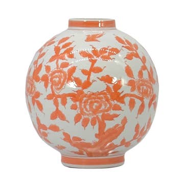 Stoneware vase with a frilly rim. Hand thrown on the wheel and altered by hand. Fired once to 1000 degrees celsius, then signed, waxed, and dipped into a glossy transparent glaze. Once dry the piece is ready for its final 1240 degree firing. Transfers are then cut and individually placed onto the piece and smoothed into place. The piece is then put back into the kiln for its third and final firing. Not dishwasher or microwave safe. The perfect size for a good bunch of sweet peas! Approximately 10cm wide x 13cm tall