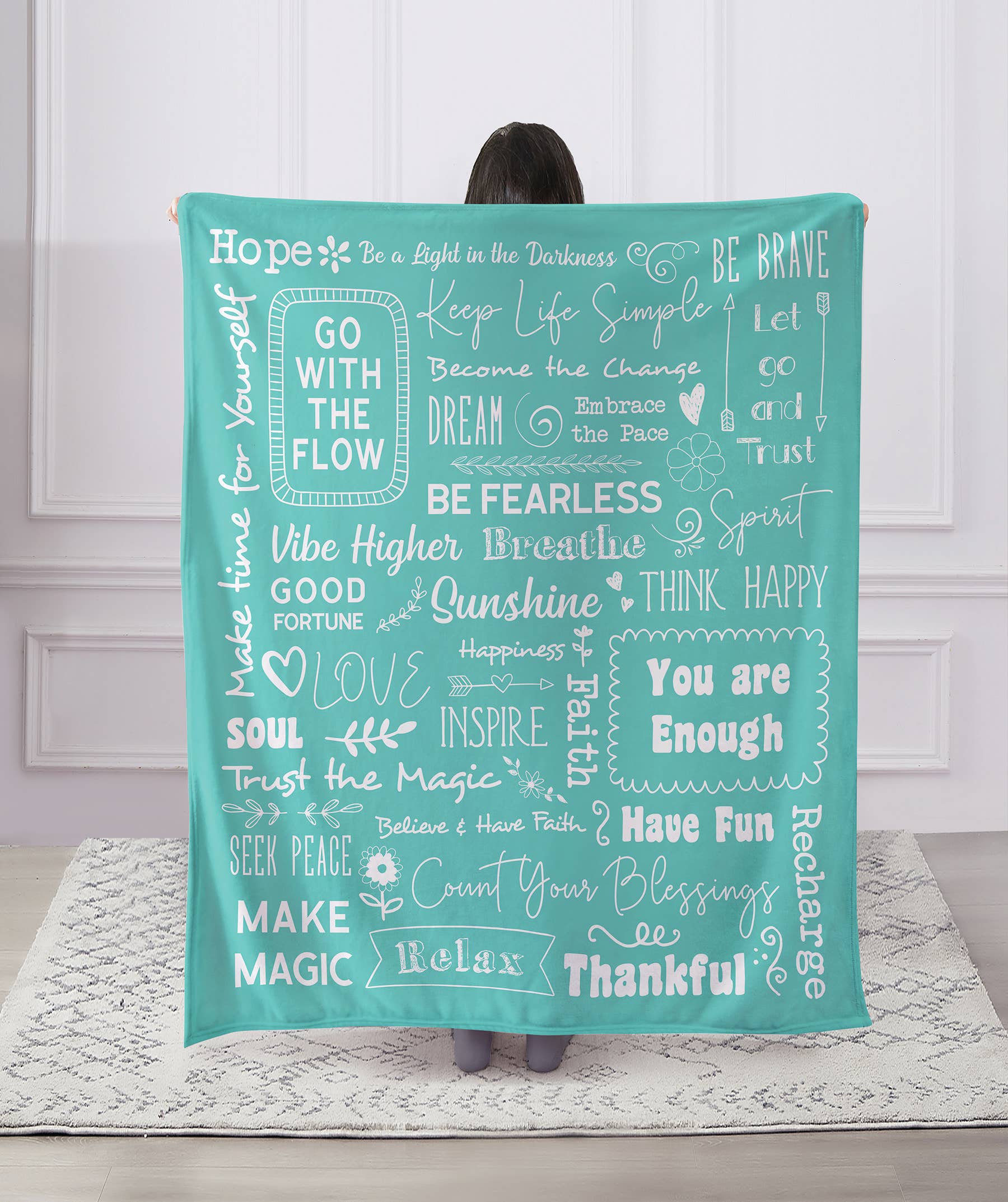 Snuggle Into Our Lady of Guadalupe’s Mantle – A Blanket Inspired by the Mother Who Never Leaves Our Side Catholic families long for a tangible reminder of Mary’s nearness in daily life. This minky blanket wraps you in the calming colors of Our Lady of Guadalupe’s mantle, helping your home feel more rooted in her comfort and care. Designed by a fellow Catholic mom with a deep love of Our Lady, this blanket is sure to bring warmth and peace to your home. The background of the blanket features a rich, radiant teal—the same hue that covers her heavenly mantle. Woven across that calming color are delicate, golden eight-pointed stars. These stars aren’t just decorative; they echo the very ones that appeared supernaturally on her garment—tiny testaments of heaven’s nearness and her maternal presence. But what makes this blanket truly unique is something far more subtle—and far more sacred. Gently worked into the design, almost like a whisper through the threads, are the words Our Lady of Guadalupe spoke during her visits to Juan Diego. Words that have comforted hearts for centuries. Words that feel as if they were spoken just for you. “Am I not here, who am your Mother?” “Let nothing discourage you.” “Are you not under my shadow and protection?” They are hidden in plain sight, slowly revealing themselves as you pull the blanket closer. These tender reminders become even more powerful when wrapped around your shoulders in prayer or curled up with a cup of something warm on a quiet evening. Whether you’re facing grief, uncertainty, or simply the day-to-day exhaustion that comes with caring for others, these words offer a mother’s comfort. A reminder that you are never alone. That Heaven sees. And that you are deeply loved—even when the world feels cold. This blanket is ideal for chilly fall mornings, snowy winter nights, or those moments when you just need to feel held. The softness will warm your body, but it’s the presence of Our Lady of Guadalupe's words that will bring peace to your soul. It also makes a beautiful, meaningful gift for anyone in need of comfort, healing, or encouragement. Whether for a mom who needs a reminder of her strength, a friend going through a hard season, or a young adult setting off on a new path, this blanket speaks the language of love and faith. Because sometimes the best thing we can give someone isn’t advice or answers—but warmth, prayer, and the quiet assurance that they are not alone. Let the Our Lady of Guadalupe Mantle Blanket be that loving presence.