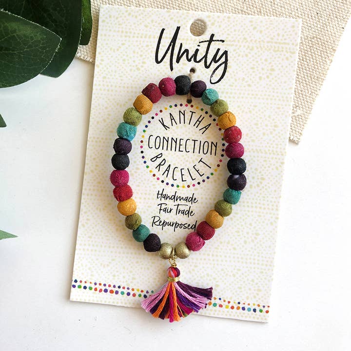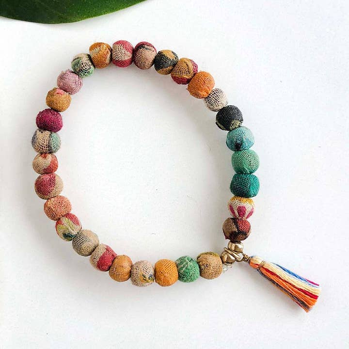 This adjustable slide bracelet is made with hand-selected Kantha textile beads, strung in rainbow gradient pattern. • Measures .5" stretches to fit most. • Sustainably handmade from repurposed cotton Sari & Kantha textiles by women artisans in India. • Colors & patterns will vary due to repurposed textiles.