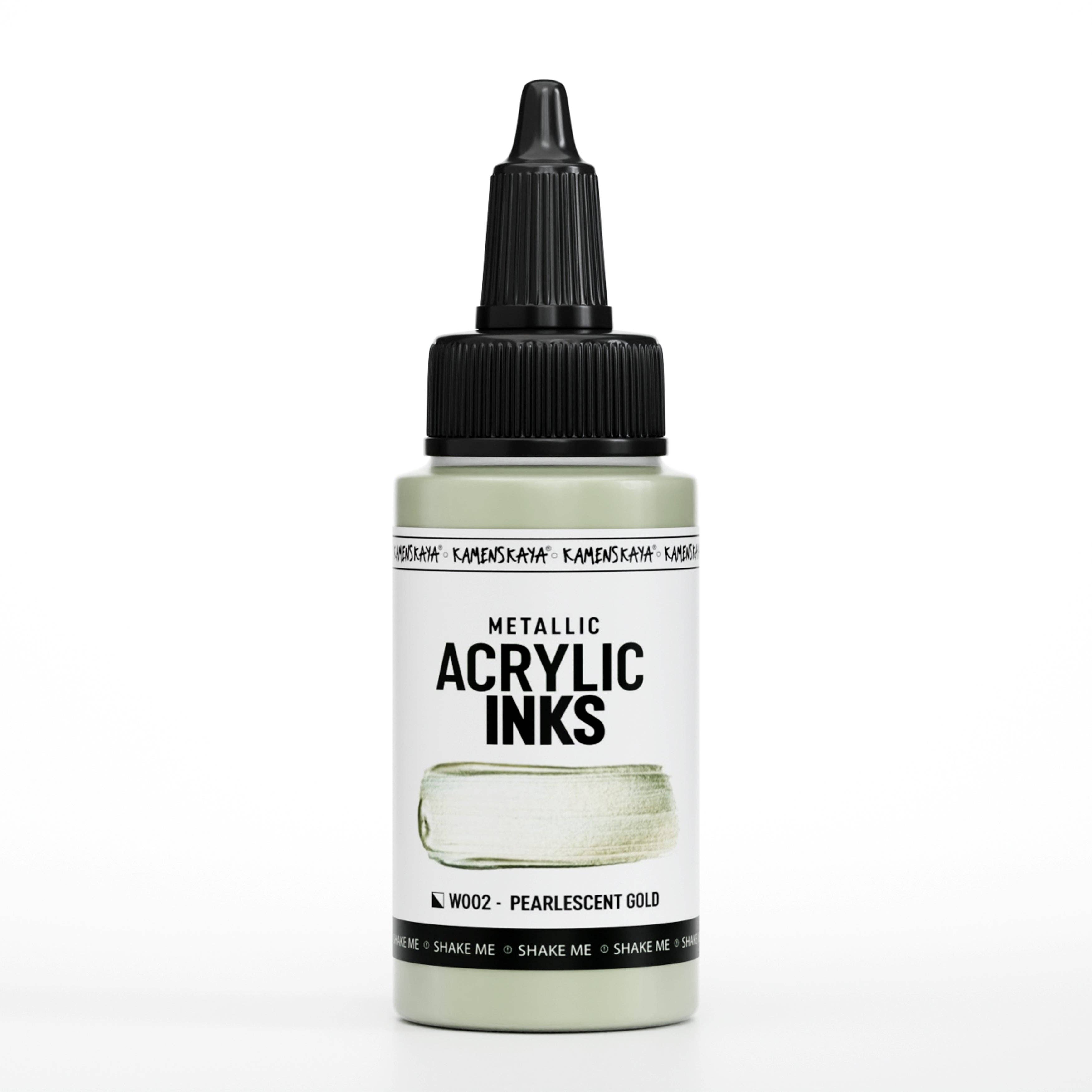 Super concentrated metallic acrylic ink (liquid acrylic paint). Perfectly imitate precious metal bleeks. Inks change their thickness depending on the medium we use with them. We can get from a very liquid form to a very thick form of paint, which gives the artist additional options when working with this material. The inks can also be diluted with water to get the most liquid consistency. The ink has a glossy finish and dries quickly. When working with a slow drying medium, it dries much slower. The ink is multifunctional in use. Suitable for drawing on paper and canvas, painting on textiles and leather goods, coloring wood and plastic. You can use the ink to tint the foundation for painting walls or furniture, and also color texture pastes and polymer clay. Excellent for mixed media work. Please note that this ink is not intended for calligraphy or for refilling markers and pens.