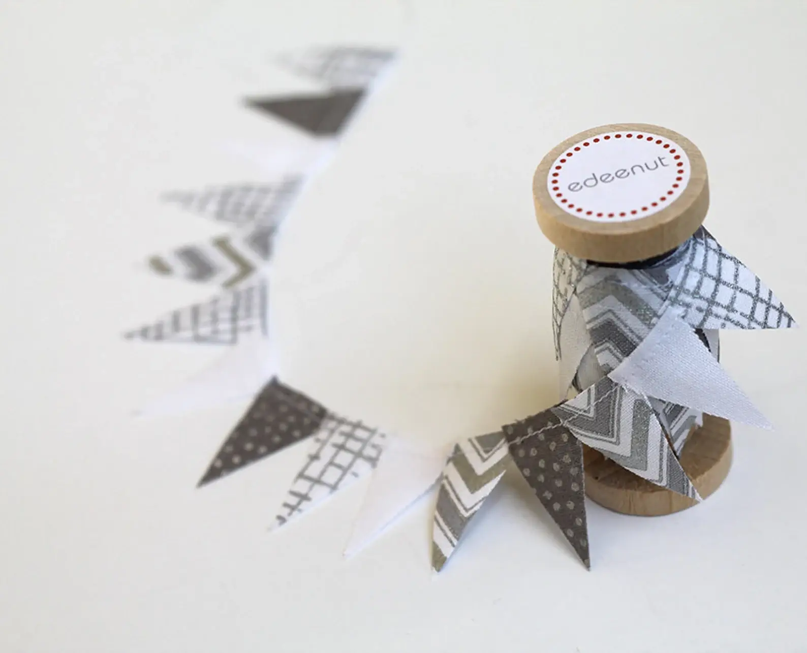 Features and Uses: -Triangles vary slightly by size as they are all hand cut, not by machine. -Snip off the desired length you need for separate packages, or just wrap it all around one present for gift giving. Secure with clear tape on back or under card. -Wrap around the cake stand/plate for Birthdays. Secure with double sided tape. -Add to dowels and use as a cake mini bunting for special occasions. -Use for card making, invitations, save the dates, and scrapbooks. -Drape across a headboard on a bed or a fireplace mantle for a festive touch. -Tie to a balloon and let drape down as a tail. -Triangles have raw edges and are fragile if handled too much. Raw edges can mean tiny loose threads. Approximate Measurements of one spool: -Total length of one spool is just over 6 feet. Extra thread is left attached on each end for hanging/tying purposes. -Each triangle is Approximately 1" long varying slightly.