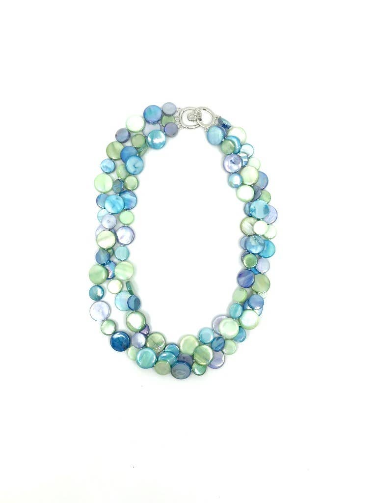 Everyone loves sea turtles! This necklace features an arrangement of cultured beach glass beads and a pewter sea turtle focal piece. Toggle clasp closure. Length 24". Each pack contains one each blue, aqua and green combo necklaces. Made in USA.